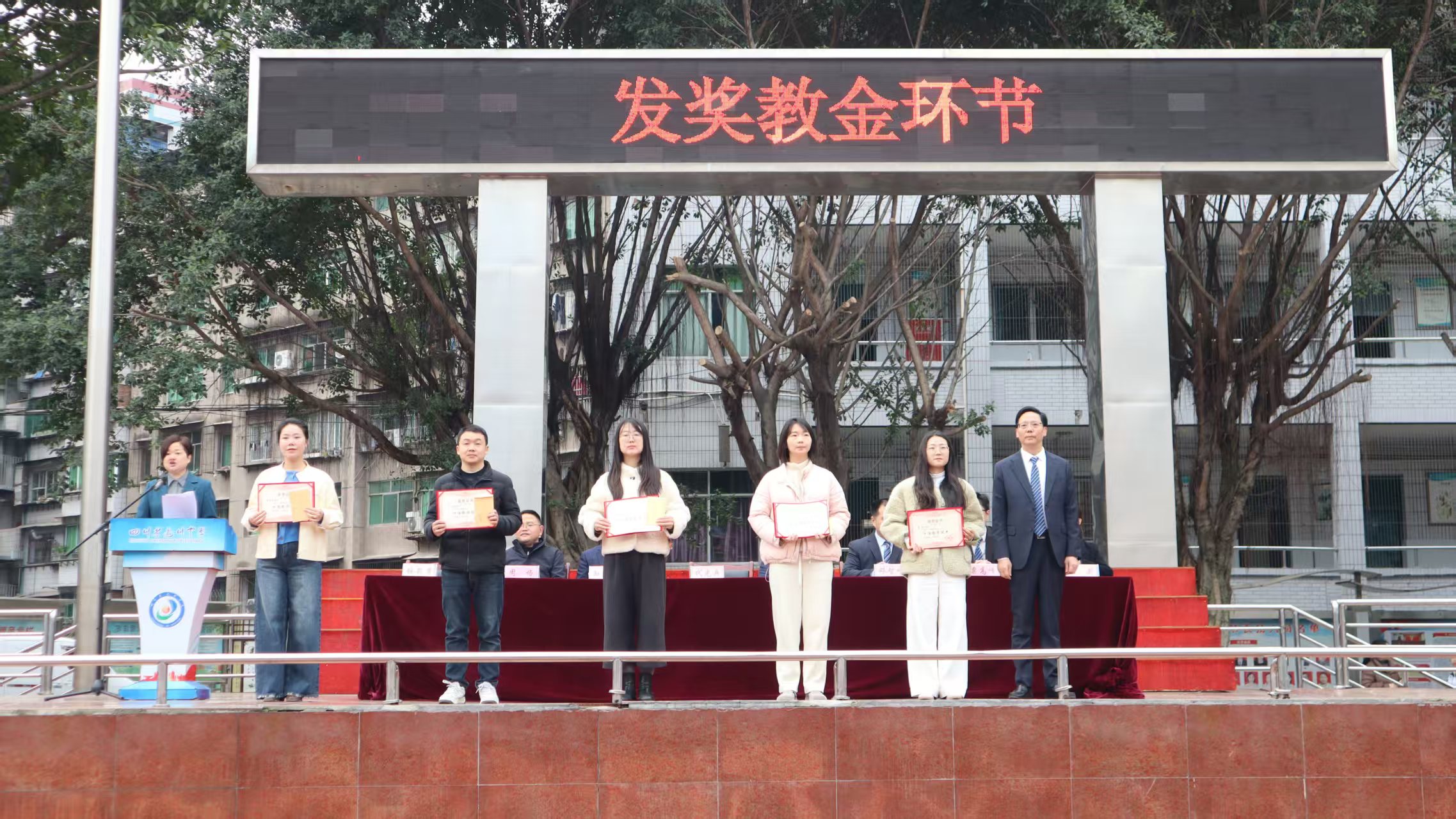 升旗仪式后,副校长王莉,纪委书记粟高峰,副校长周炀、邓智峰、孙仁成分别宣读文件,为过去一学期中表现突出的师生予以表扬。学校领导依次颁发了优秀志愿者、三好学生、优秀学生干部、优秀艺体特长生、优秀心理委员、优秀宿管干部、优秀文明纠风队等各项奖状。同时,学校还利用“智华奖教金”奖励了学习优胜者和十佳教学能手。获奖学生依次上台,从校领导手中接过荣誉证书,阳光下,他们的笑容格外灿烂。党委书记代光兵为获得“十佳教学能手”称号的教师颁发了证书和“奖教金”。台下掌声如潮,是对榜样的致敬,更是对新学期的期许。