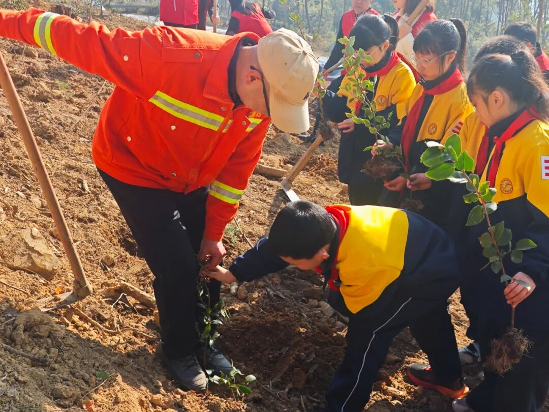 植绿护绿正当时,同心共建生态城。在特邀专业园艺老师的指导下,活动现场春意盎然,师生与党员教师热情高涨、分工协作。党员教师率先垂范、冲锋在前,与少先队员们一同挥锹挖坑、扶苗定植、培土压实、提水浇灌,以实际行动践行初心使命,为春日山林增添一抹鲜亮的“党建红”与“生态绿”。