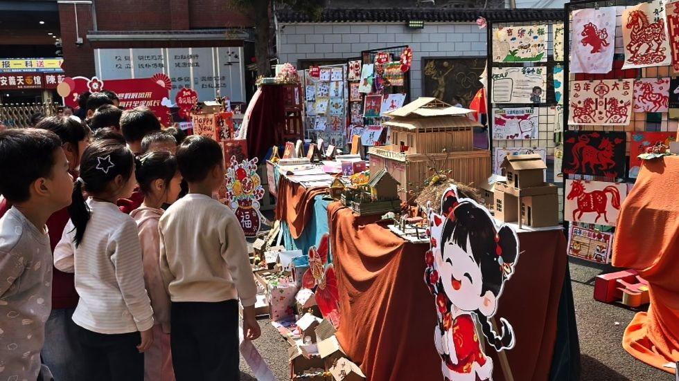 各年级展区特色鲜明、亮点纷呈:一二年级作品童趣灵动,识字小报、手工年历、胖胖小马剪纸、自制小乐器等作品,尽显低段学子的童真与巧思;三四年级作业扎实充实,春联灯谜收集、春节开支条形统计图、套色剪纸、文化研学记录等,兼具实践性与探究性,学科综合素养稳步提升;五六年级作品彰显深厚底蕴与创新创意,汉字起源研究、家庭与小区平面图设计、八骏风姿剪纸、原创歌词创作等,既展现出自主探究能力,更饱含着学子对成长的感悟和对未来的美好期许。