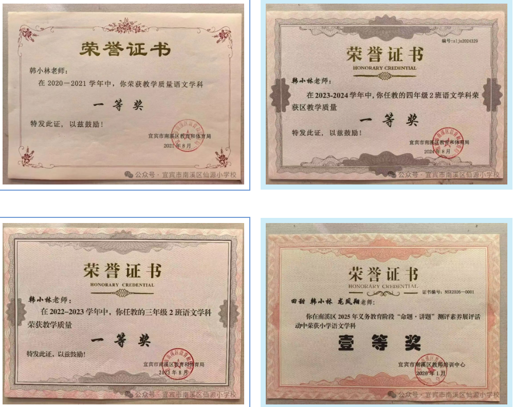 三尺讲台守初心,四季耕耘育桃李。韩小林老师的坚守与付出,收获了累累硕果与满满赞誉:先后荣获“宜宾市骨干教师”、“南溪区优秀少先队辅导员”等称号;多次斩获区教学质量一等奖;在各级赛课、论文评比、技能大赛中屡获佳绩;指导学生参赛捷报频传。面对掌声与赞誉,她始终淡然谦逊:“我只是做了一名普通教师应该做的事,看到孩子们在关爱中成长,在学习中收获知识和品格,就是我最大的满足。”