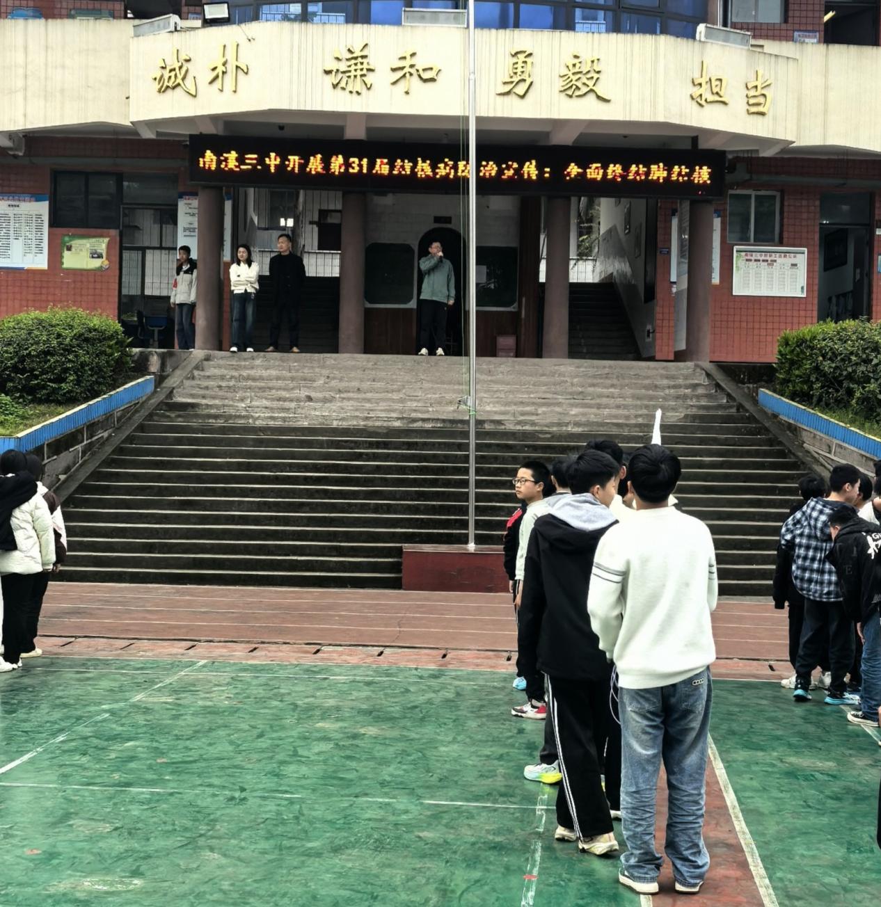 周一升旗仪式上,学校开展“全面终结结核危害”主题国旗下演讲。学生代表在庄严的国旗下,向全校师生普及结核病防控核心知识,强调“健康第一”的理念,号召全体师生积极参与防痨行动,共筑校园健康防线。