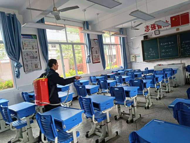 理论学习之外,学校更注重环境的卫生安全。专业消杀人员对教室、宿舍等重点区域进行了全面喷洒消毒,重点对课桌椅、地面、窗台等角落进行消杀处理。