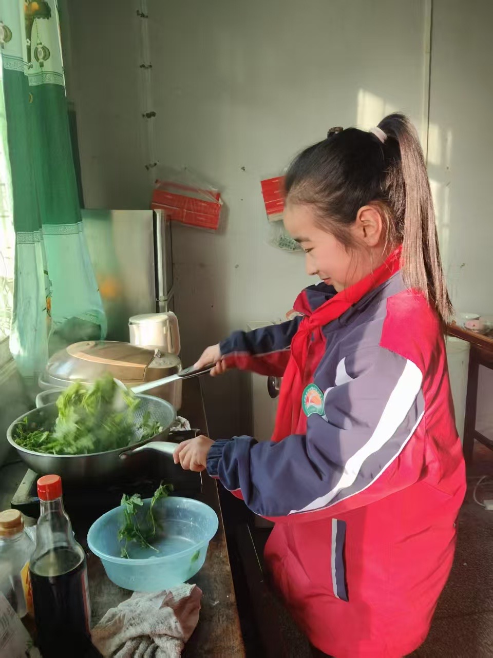 低年级同学带着这份特别的礼物回家,和爸爸妈妈一起动手烹饪,鲜香汤锅、清炒菜尖、豌豆尖酥肉汤、蒜苗肉丝等一道道家常美味,让劳动的快乐与家庭的温暖完美相融。