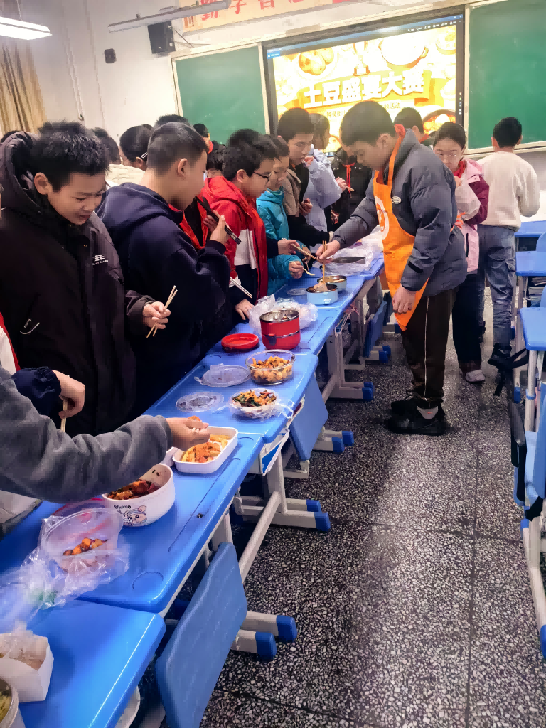 活动首先在各小组内展开。同学们纷纷亮出拿手好菜,并现场进行即兴推介,经过激烈角逐,每组推选出一名代表携本组招牌美食晋级班级推荐赛。随后,各位“小厨神”依次登台,自信大方地介绍自己的土豆佳肴:酸辣土豆丝刀工精细,土豆泥沙拉造型可爱,狼牙土豆香气扑鼻……精彩的即兴发言赢得阵阵掌声。