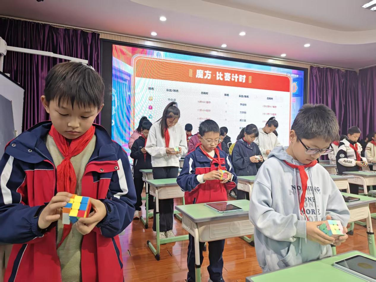 尤其是魔方竞速环节,同学们指尖飞速旋转,全神贯注、沉着应战,展现出出色的专注力与逻辑思维能力,将活动推向高潮。整场活动秩序井然、欢声笑语不断,让数学从课堂走进生活,从知识变为乐趣。