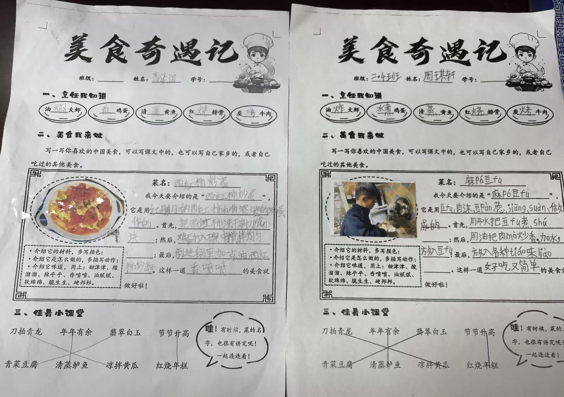 周末里,孩子们化身“小小美食家”,和家长共同商定拿手菜,从认识食材、择菜洗菜,到安全参与搅拌、简单切配、成品摆盘,全程深度参与烹饪全过程。孩子们认真记录制作步骤,用“甜津津、香喷喷、酸溜溜”等词语描述美食味道,还和家长一起探索菜名背后的美好寓意,如“年年有余”“节节升高”,在动手实践中读懂中华饮食文化的温度,完成《美食奇遇记》实践作业单,定格劳动的美好瞬间。