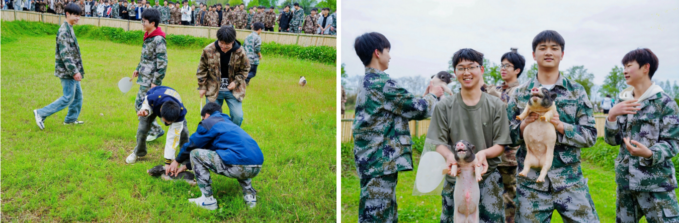 如果说竹竿舞是雅致的民俗体验,那田园抓猪就是接地气的欢乐狂欢!泥地里的小猪憨态可掬,同学们撸起裤腿,不顾泥土沾衣,追着小猪在田埂间奔跑。有的同学设下“包围圈”合力围堵,有的同学看准时机精准下手,虽然满身泥泞,却笑得比阳光还灿烂。这场“猪”事大吉的游戏,不仅释放了学习的压力,更让大家在协作中学会了配合,在亲近动物中懂得了自然的鲜活,原来泥土里的快乐,比任何电子游戏都更让人难忘。