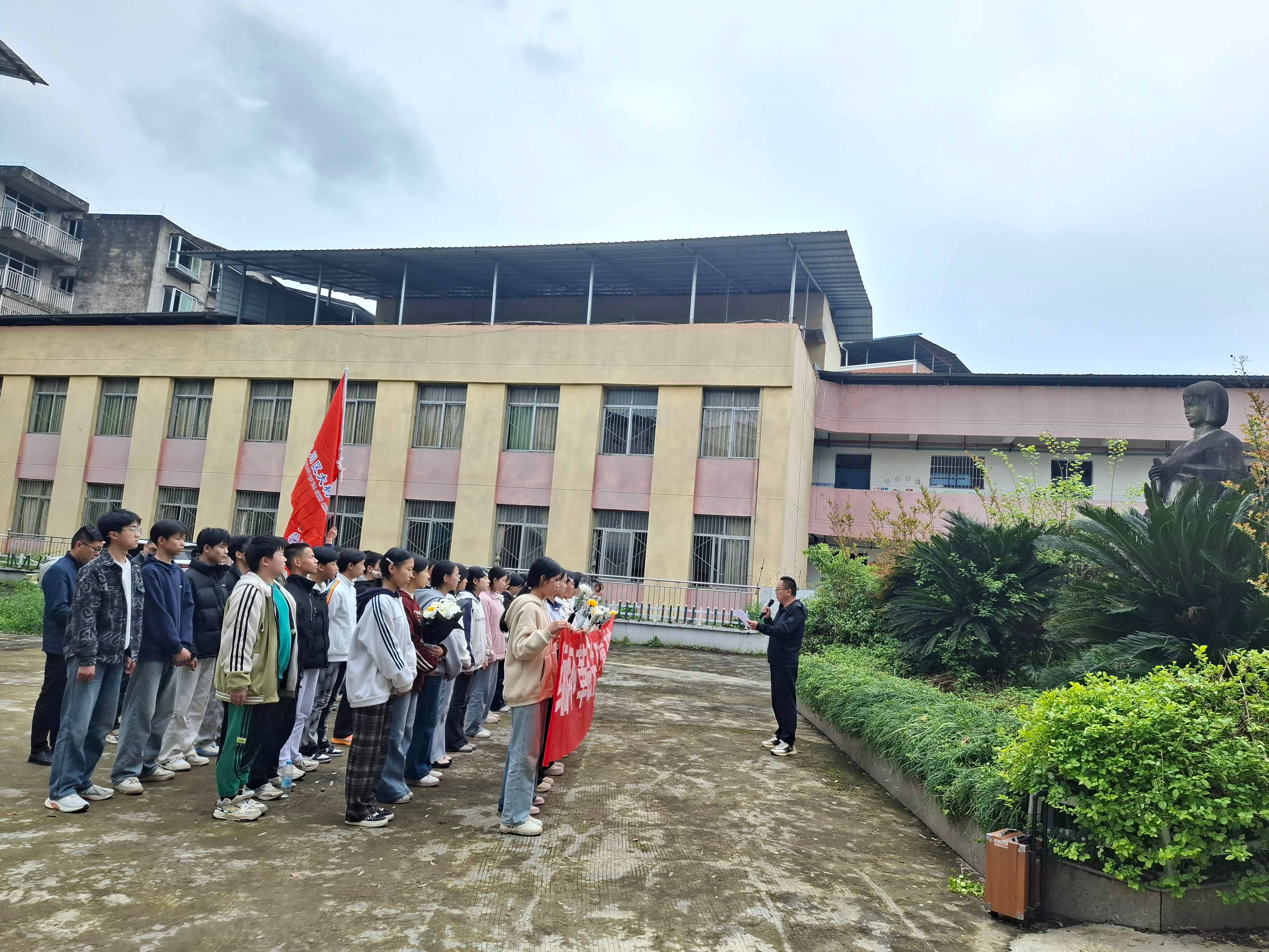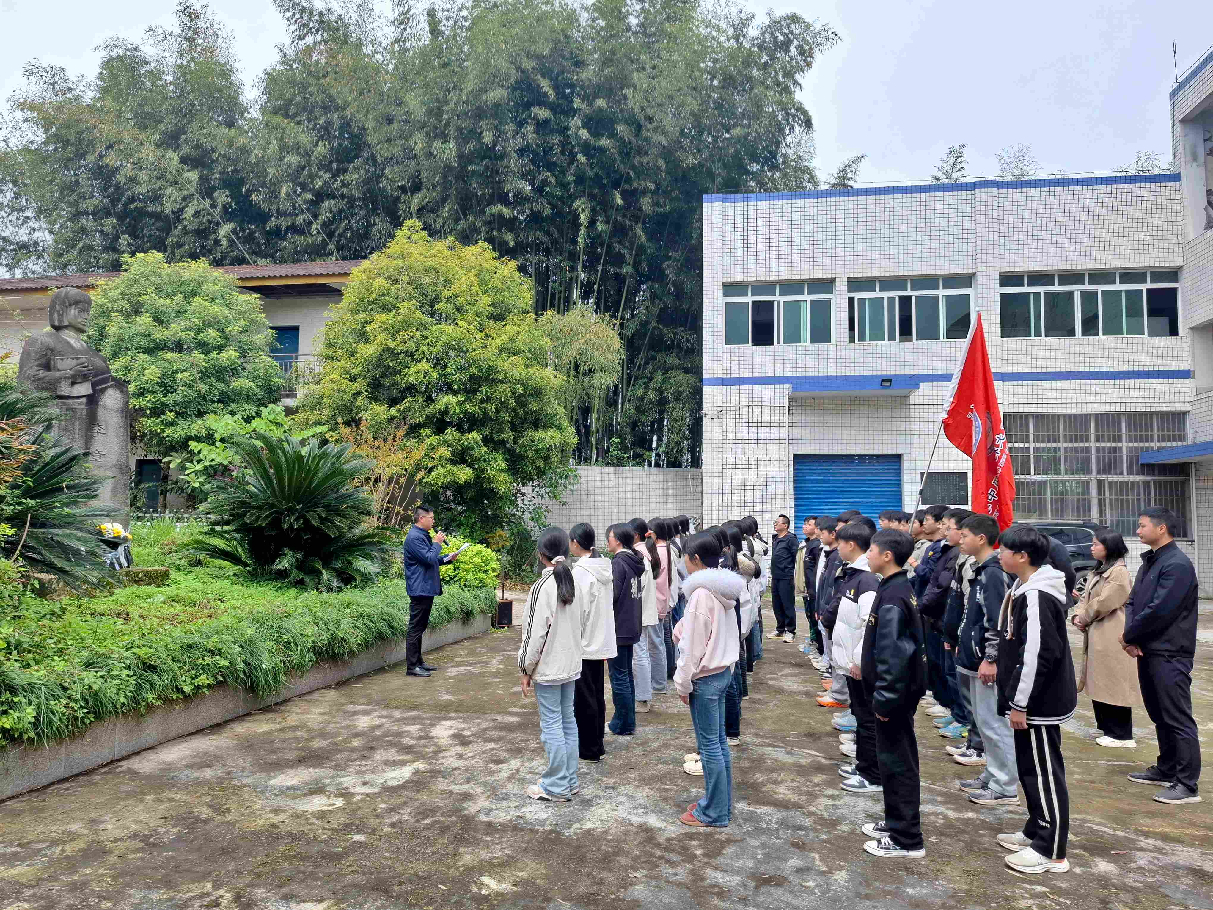 师生整齐列队,旗手高举着鲜红的校旗,迈着铿锵的步伐,来到祭祀场地。师生整齐列队,齐声高唱国歌。