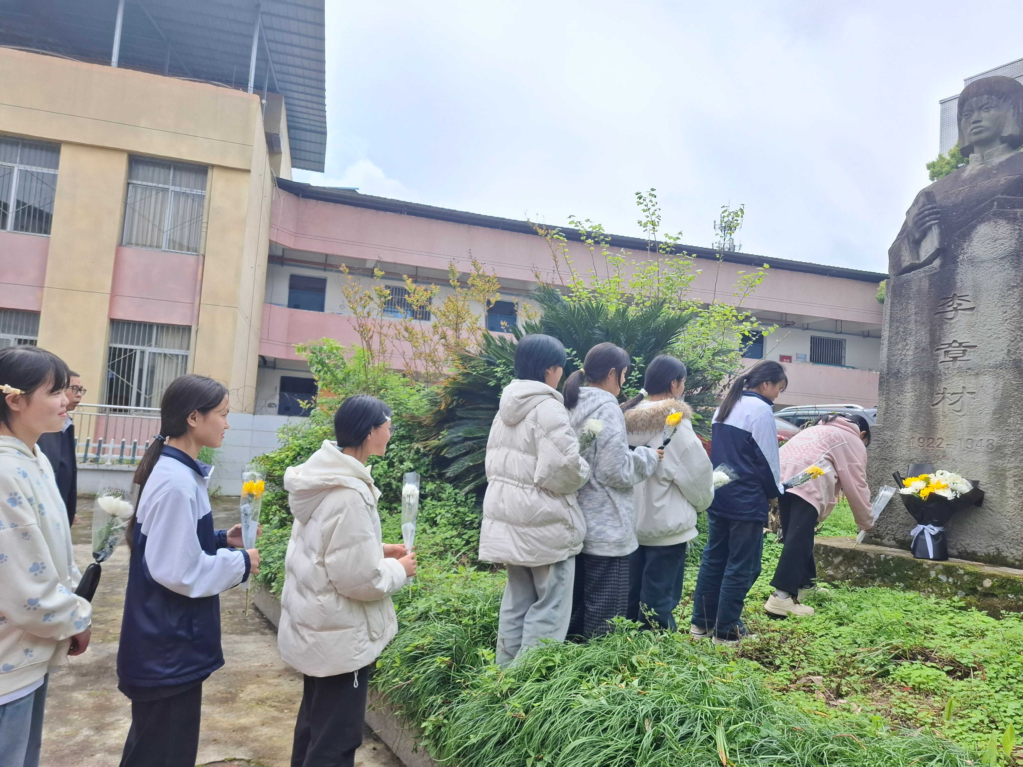 学校工会主席鲁骞神情庄重地走近李章材烈士,将花束敬献在纪念碑前,向老校长致以最崇高的敬意。团员和入团积极分子在团员培养联系人八年级年级组长秦颖老师的带领下向李章材烈士献花。
