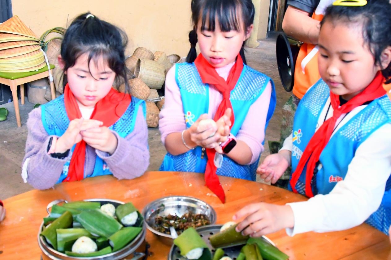在学做软雀粑环节,队员们上山采集软雀草,老师讲解制作方法并示范揉面、包馅。队员们认真聆听后纷纷动手制作,相互交流帮助,现场欢声笑语不断。不一会儿,形状各异的软雀粑诞生,承载着大家的快乐与成就感,最后品尝软雀粑为活动圆满收官。