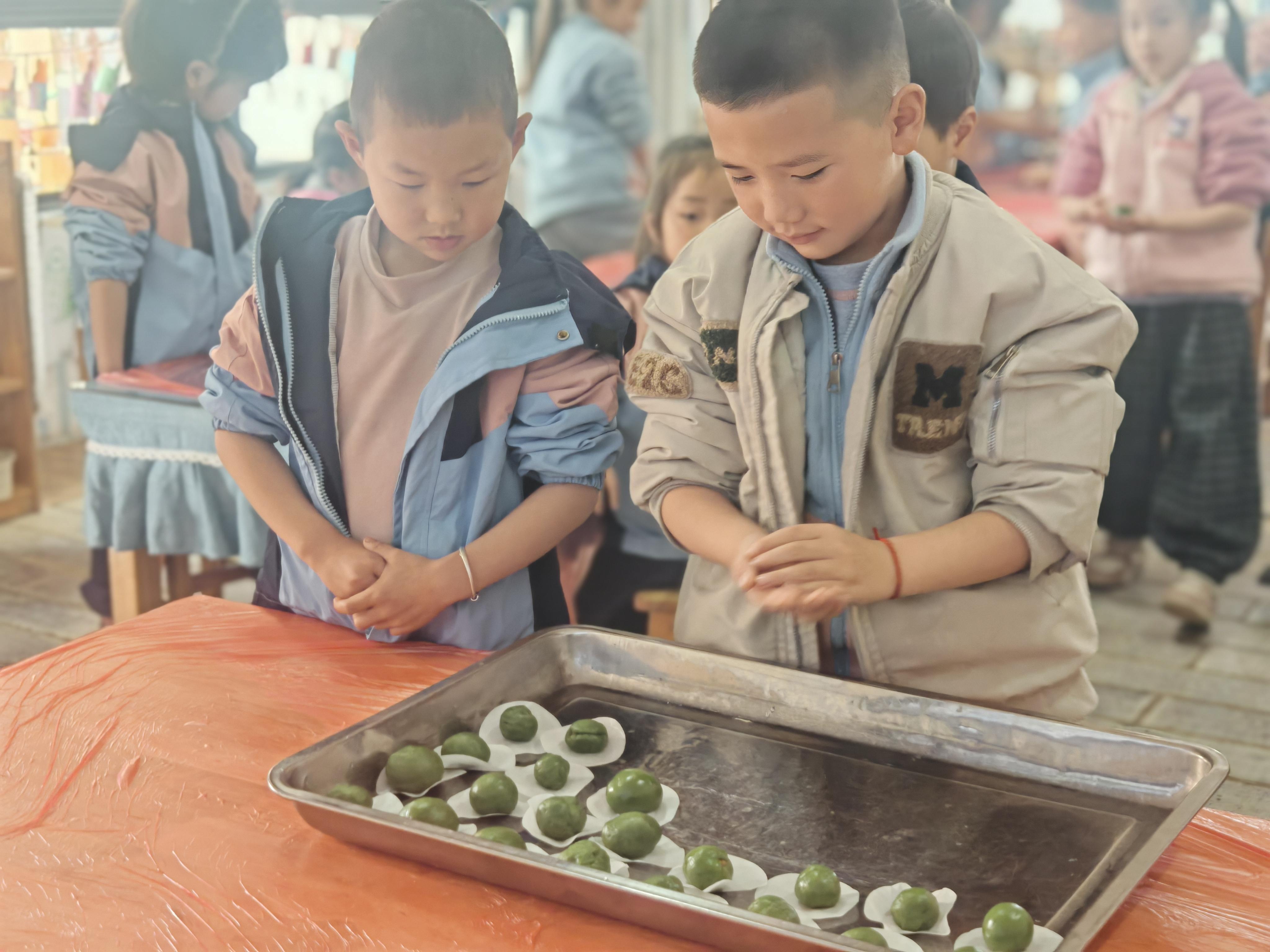 大班以“实践悟清明”为核心,开展做青团实践活动。教师提前准备好艾草、糯米粉、红豆沙、黑芝麻馅等食材,先向幼儿讲解青团的历史由来与制作习俗,随后分步示范揉面、包馅、塑形、蒸煮的完整流程。在教师指导下,幼儿分组合作,有的揉面将糯米粉与艾草汁混合均匀,有的捏取面团包裹馅料,有的用模具压出精致花纹。活动中,幼儿不仅掌握了青团的制作方法,更在实践中体会到劳动的快乐与传统习俗的文化价值。