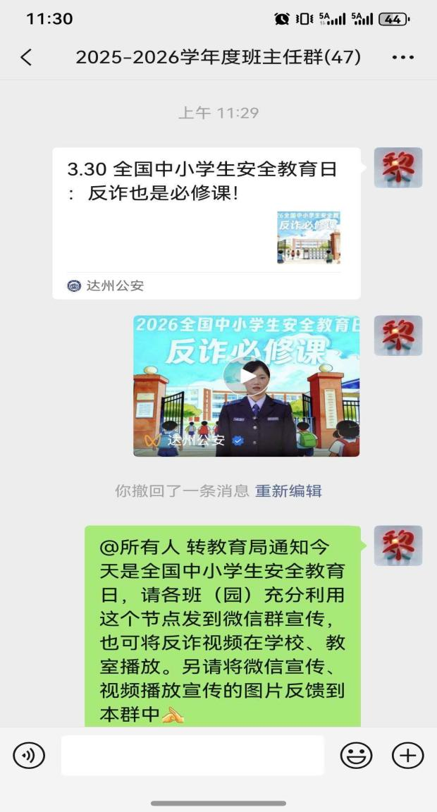活动前期,学校通过校园电子屏滚动播放“同守护,共成长--第31个全国中小学生安全教育日”主题标语,营造浓厚的安全教育氛围,让安全意识融入校园的每一个角落。同时,学校积极响应教育局通知要求,通过班主任工作群部署宣传任务,组织各班将反诈宣传内容、安全教育日致家长的一封信等推送至班级家长群,打通家校共育的安全防线,引导家长共同参与到学生安全教育中来,形成家校协同守护的良好氛围。