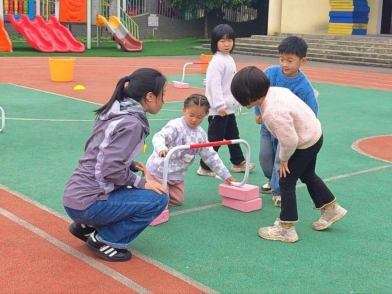 在江南中心幼儿园活动现场,博学街幼儿园大班老师李萍的《小勇士跨跳挑战》正在开展,该活动以勇士闯关情境构建三阶助跑跨跳递进任务,通过设置不同宽度的障碍,适配幼儿个体差异,让幼儿在挑战中收获成长。