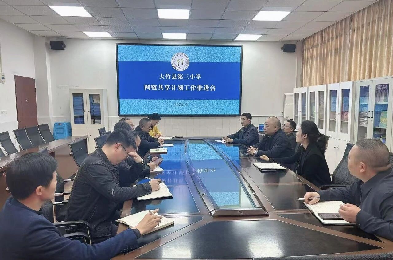 2026年4月3日,大竹县第三小学组织各年级教研组长和学科组长,在学校会议室通过腾讯会议平台,全程参与由引领校达川区实验小学主办的“网链共享计划”线上专题工作会。
