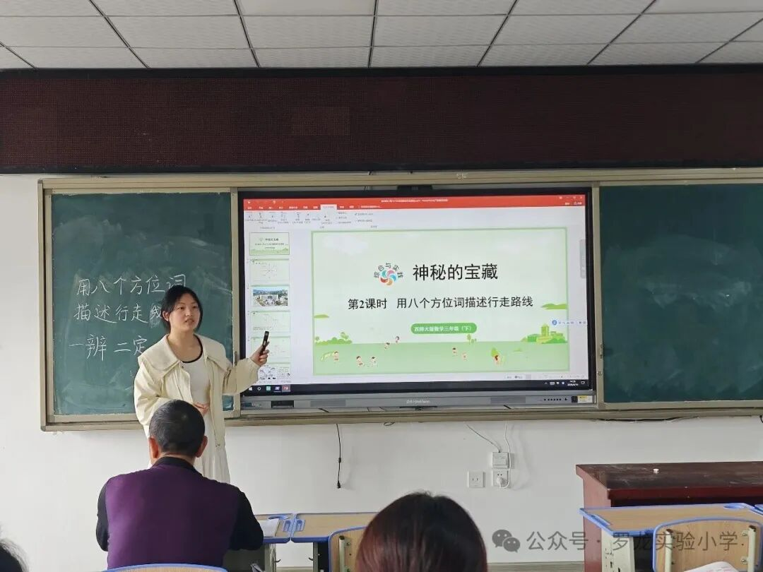 为深入推进学校“青蓝工程”建设,助力青年教师快速成长、锤炼教学本领,搭建教学交流与能力提升的优质平台,4月15日下午,罗龙实验小学数学教研组开展青年教师第二次汇报课教研活动。本次活动由李水莲主任主持,全体数学教师参会,“青蓝工程”青方陈玉莲老师执教小学数学《寻找神秘宝藏——用8个方位描述行走路线》,蓝方张兴梅老师及各年级数学组长全程参与听课评课,以研促教、以评助学。