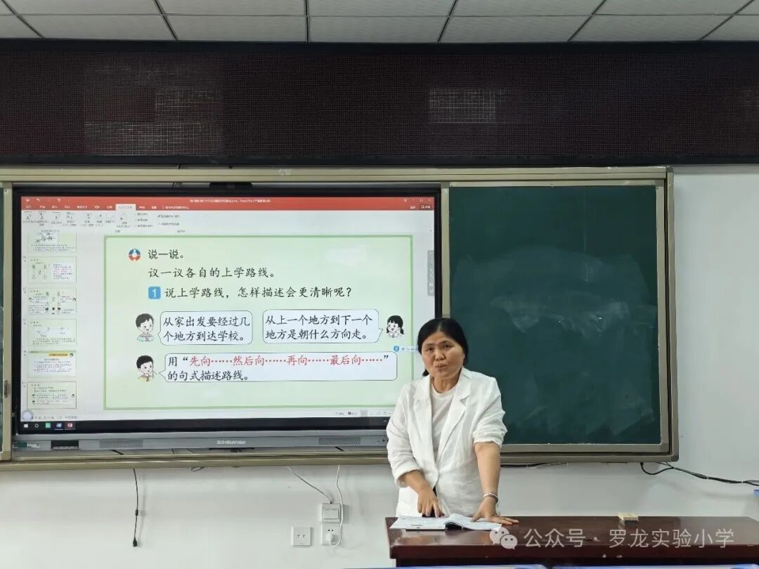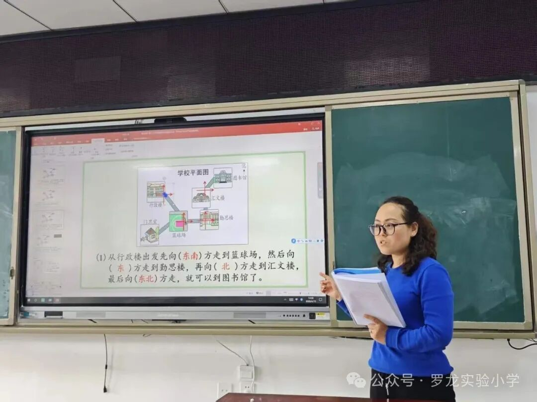 课堂上,陈玉莲老师紧扣学生认知特点,以“复习铺垫—新知探究—巩固应用”的逻辑层层推进教学:先带领学生回顾东、南、西、北等8个方位词,再播放学校航拍视频,用学生熟悉的校园场景快速激发学习兴趣,为新课学习筑牢基础;随后以“从行政楼到图书馆”“从行政楼到篮球场”等路线为载体,聚焦“观测点变化”这一重难点,反复强调“观测点变了,方向就变了”,并提炼“一辨方向标、二定观测点、三描路线”的解题方法,搭配“先向……然后向……”的规范表达模板,帮助学生理清思路;后续通过“小动物串门”情境、小组讨论、同桌互练等环节,从具体场景过渡到抽象点位描述,层层深入巩固知识,充分凸显学生主体地位,有效锻炼了学生的空间思维与语言表达能力。课后,说课评课环节有序开展。陈老师结合课堂实况,坦诚地分享了教学设计思路与教学反思。
