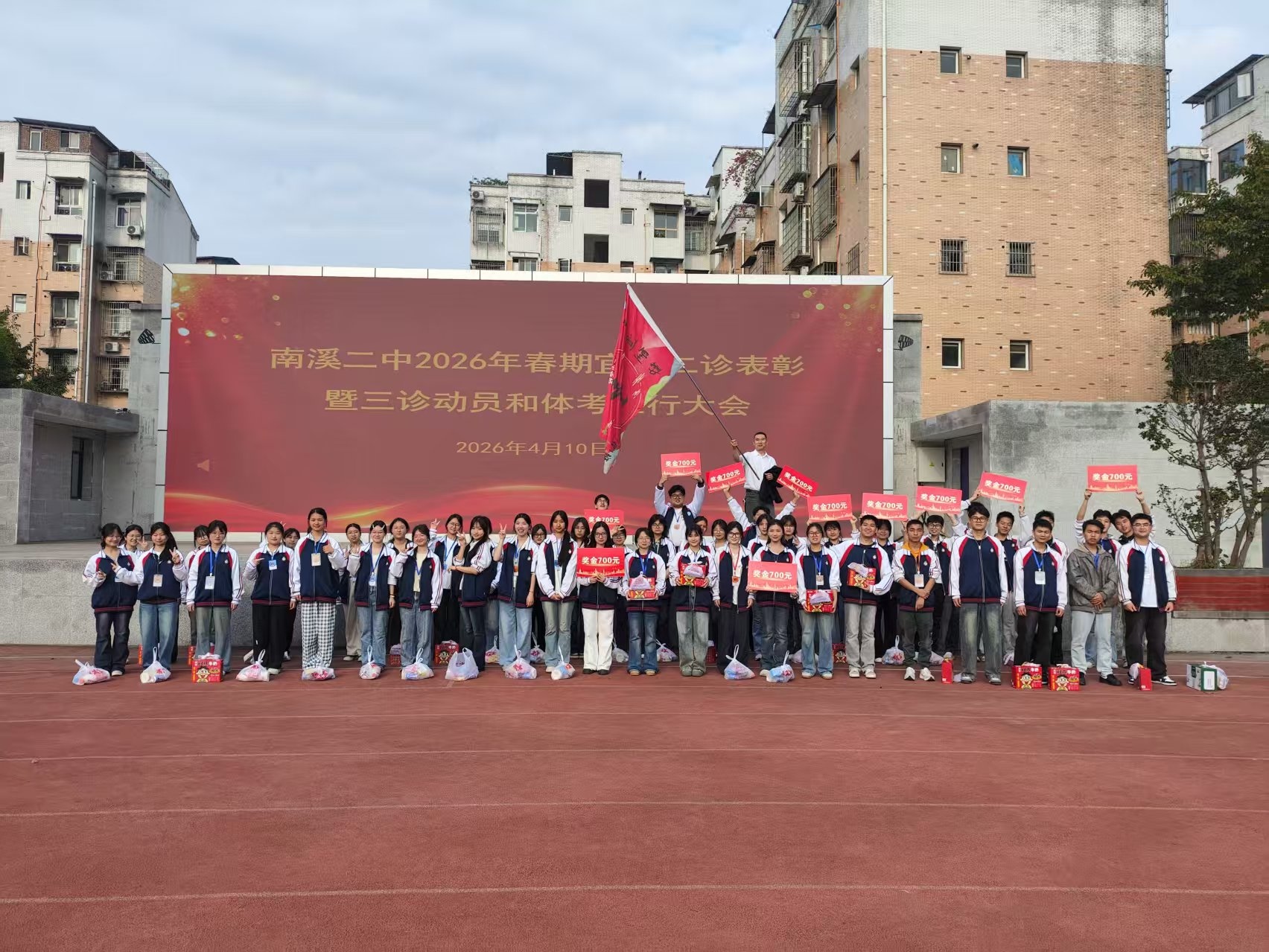 春风浩荡战鼓催,少年砺剑正当时。2026 年 4 月 10 日,南溪二中高 2023 级宜宾二诊表彰暨三诊动员大会与体育生体考壮行大会举行。全体高三师生齐聚校园表演台,以荣光致敬拼搏,以誓言点燃壮志,以壮行奔赴理想,场面庄重热烈、气势如虹。