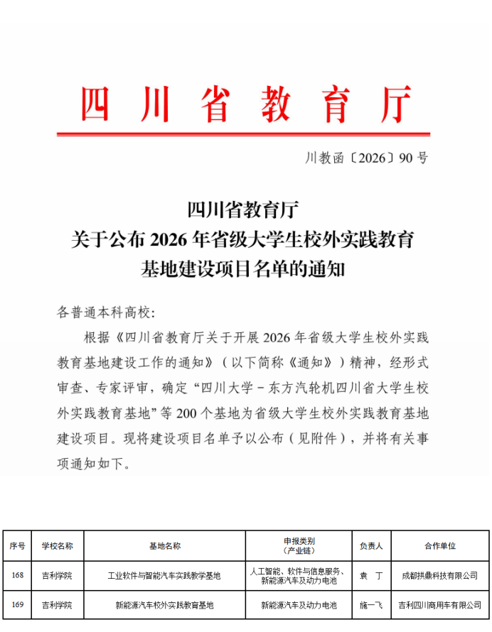 作为世界500强企业吉利控股集团创办的应用型高校,吉利学院自创办以来便将产教融合、校企合作视为人才培养的核心路径,始终坚持把校外实践教育基地建设作为深化实践教学改革、提升人才培养质量的关键抓手。学校紧扣四川省人工智能、软件与信息服务等重点产业链,聚焦数字化、智能化特色发展方向,精准对接行业人才需求,携手优质企业共建特色实践育人平台,推动实践教学与企业生产、行业发展同频共振。此次获批的两个省级校外实践教育基地,正是学校这一办学理念的具体实践,各具鲜明特色、精准对接产业需求。