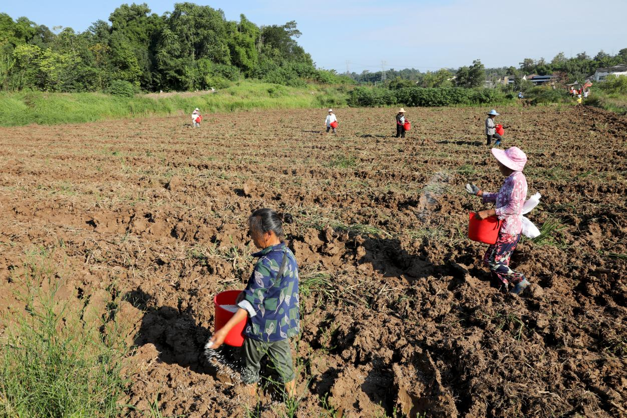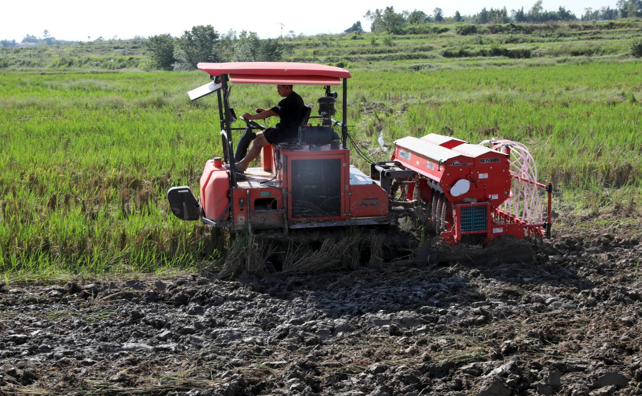 10月10日,四川省广安市广安区的油菜种植正如火如荼地进行,机械化直播和人工撒播油菜有序推进。