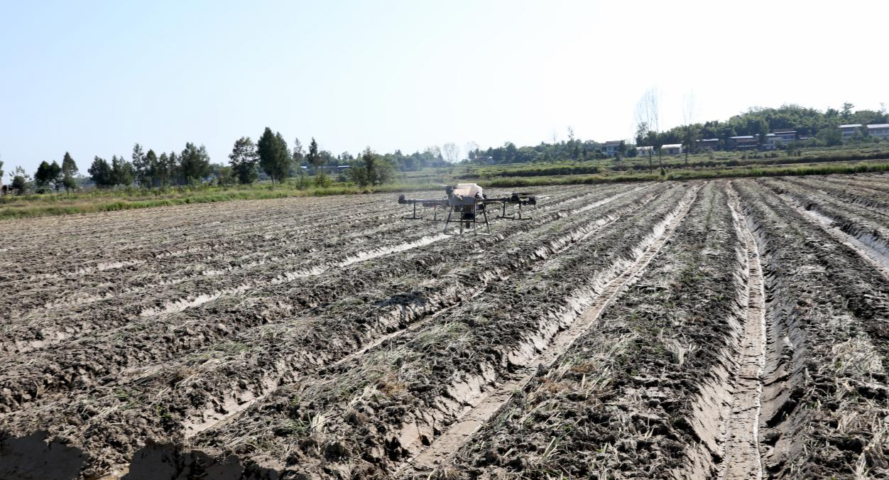 广安市广安区花桥镇竹林村“稻-油”轮作基地,无人机在稻田上空播撒油菜种子