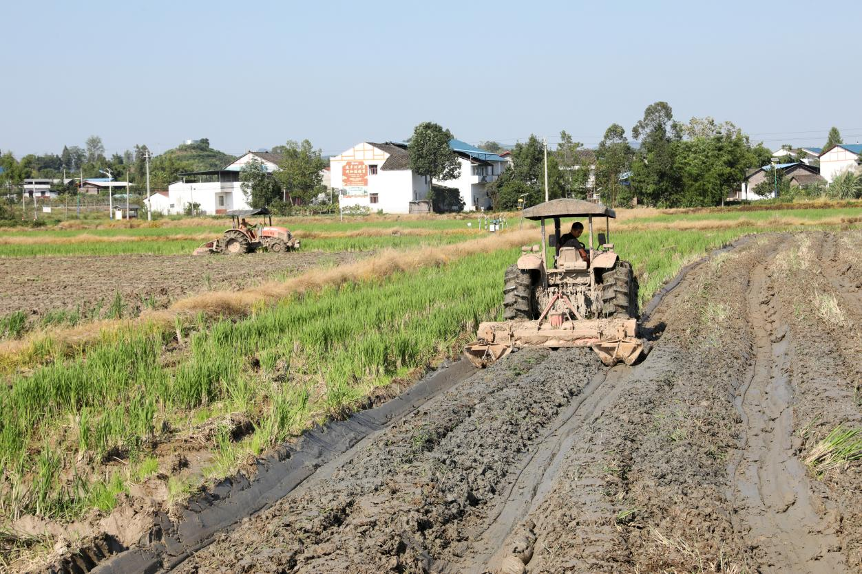 竹林村“稻-油”轮作基地,久保田耕整机在整地排沟,为油菜无人机播种备耕
