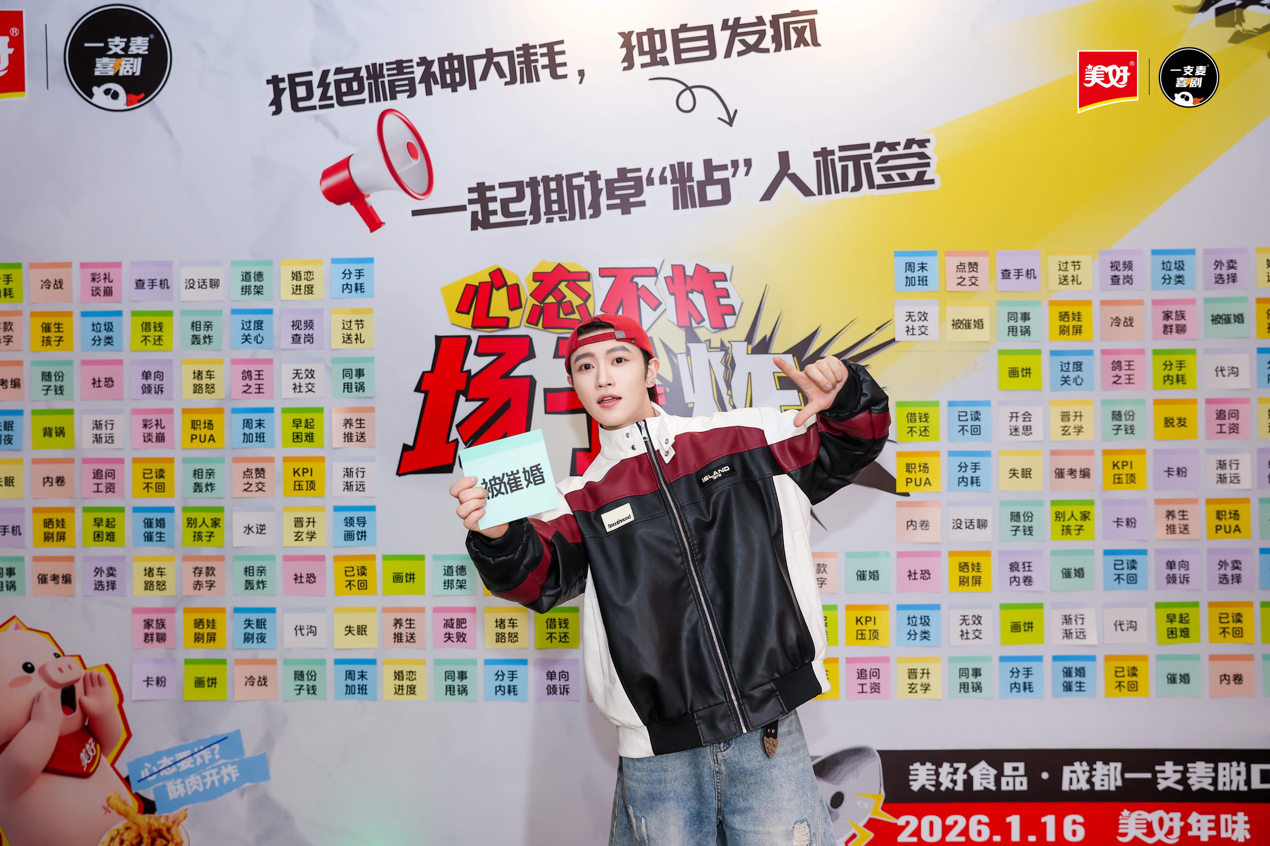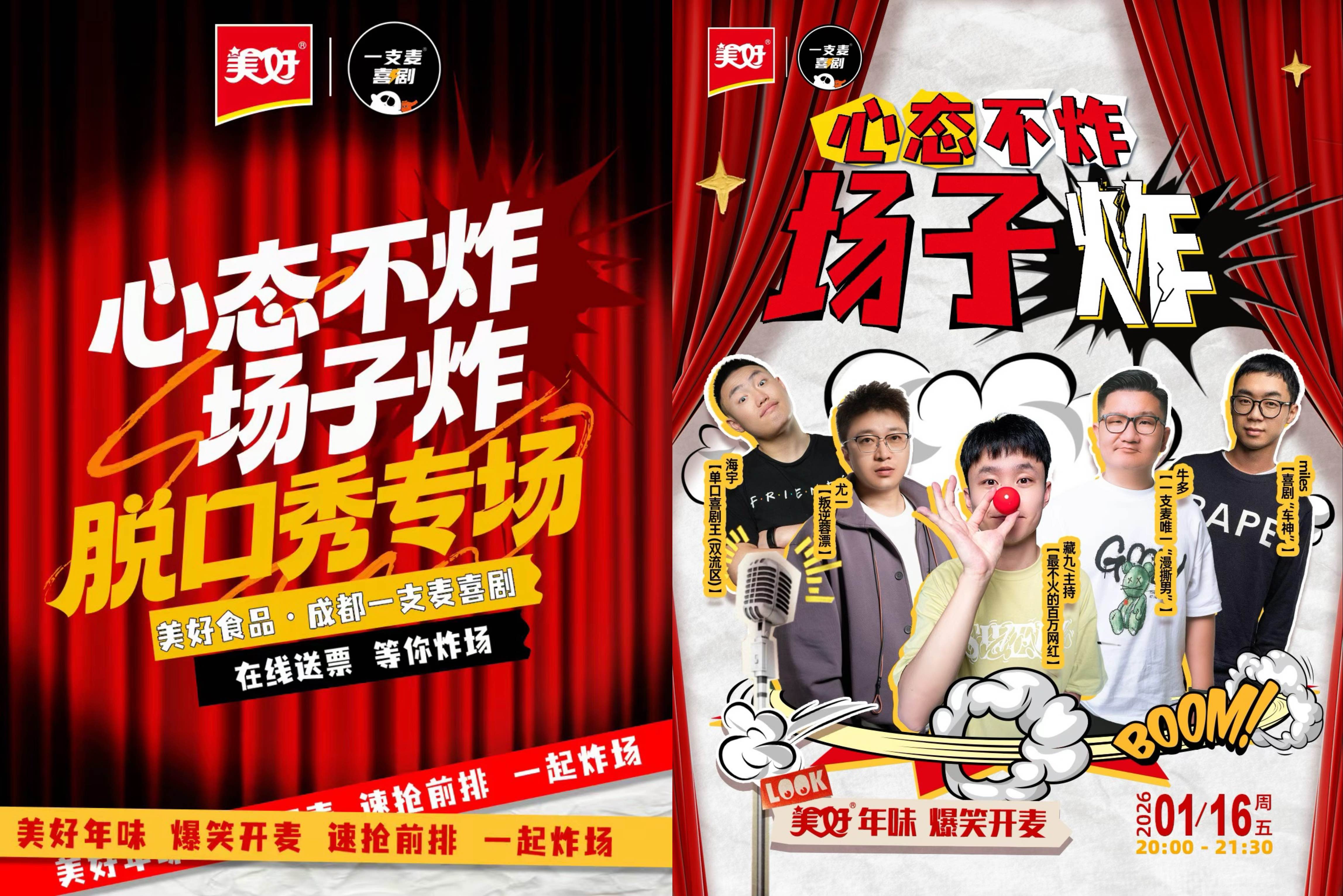 当大多数品牌仍然沉浸在以“团圆”为核心的传统叙事时,美好食品敏锐地洞察到,在宏大而熟悉的节日叙事之下,一种名为“年关焦虑”的情绪正在年轻群体中滋生。社交压力、家庭期待与自我审视等元素相互交织,使春节在节庆表象下承载了一份无形的情感负担,而脱口秀这一兼具年轻表达与情绪解压功能的艺术形式,成为了破局的载体。基于这一判断,美好食品决定跳出传统年节团圆营销红海,联合成都一支麦喜剧,用一场脱口秀抢占春节档的先机,释放出CNY营销的新价值。