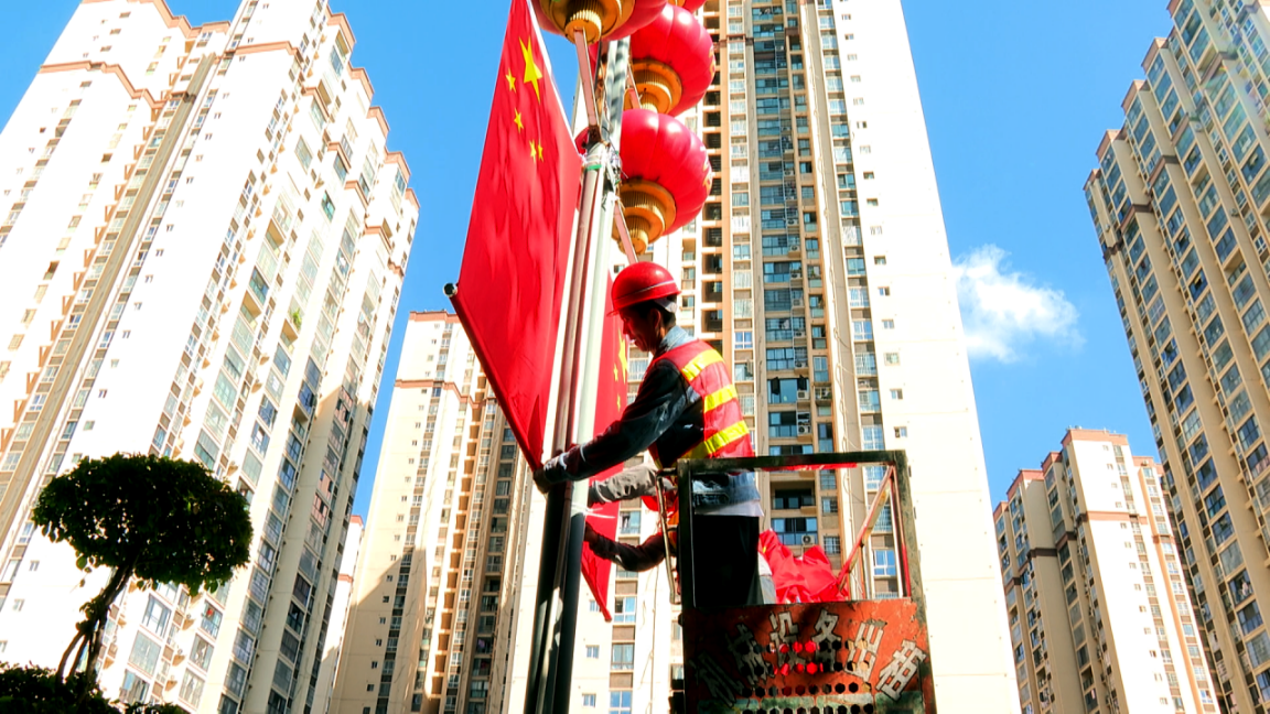 在建业大道、渝邻大道等路段,工作人员借助高空作业车,细致地将国旗固定在路灯杆上,并反复调整角度,确保整齐划一。阳光映照下,红旗迎风轻展,整条街道仿佛披上了“红色铠甲”,吸引不少市民驻足留影。