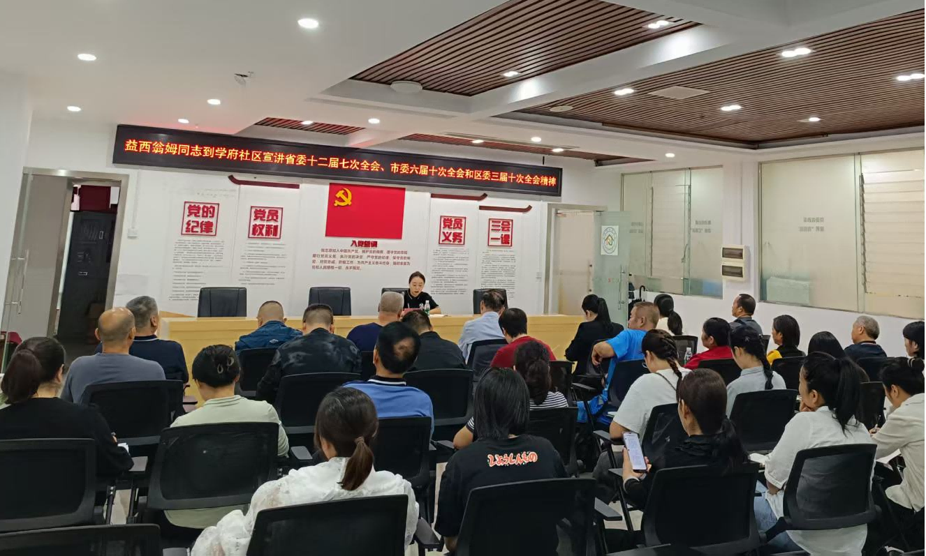 9月26日上午,宜宾市南溪区仙源街道党工委副书记益西翁姆深入学府社区,面向党员、社区专职工作者及居民代表,专题宣讲省委十二届七次全会、市委六届十次全会和区委三届十次全会精神,重点解读《关于推进文旅体商深度融合发展加快建设国际旅游城市示范区的决定》《关于走好新时代党的群众路线进一步推动物质富足精神富有社会有序的决定》,并对社区层面落地落实全会精神作出具体部署。