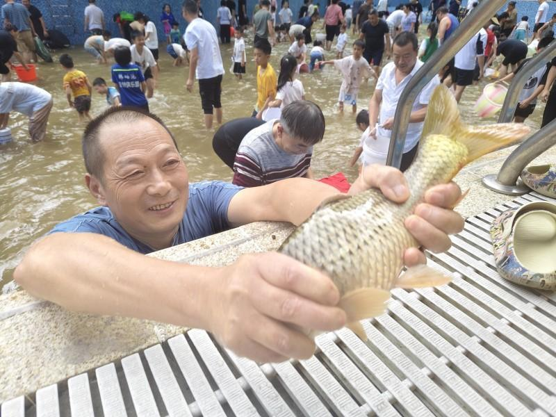 活动尚未开始,长江大院的捕鱼池旁已人头攒动,大人小孩摩拳擦掌,早早带了捕鱼工具等候。随着主持人宣布活动开始,居民们有序进入捕鱼区域,瞬间开启了一场充满欢乐的“捕鱼大战”。有的家庭分工协作,父母围追堵截,孩子负责用小网捕捞,池边不时传来“抓到了!抓到了!”的欢呼;有的居民凭借娴熟技巧,眼疾手快将一条条鲜活的鱼儿收入网中;还有的邻里相互支招,分享捕鱼小窍门,原本互不熟悉的居民在协作中渐渐熟络起来。