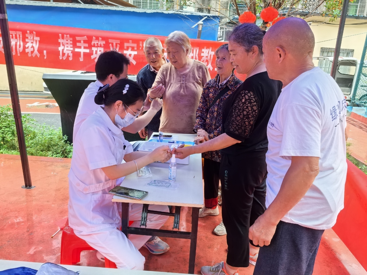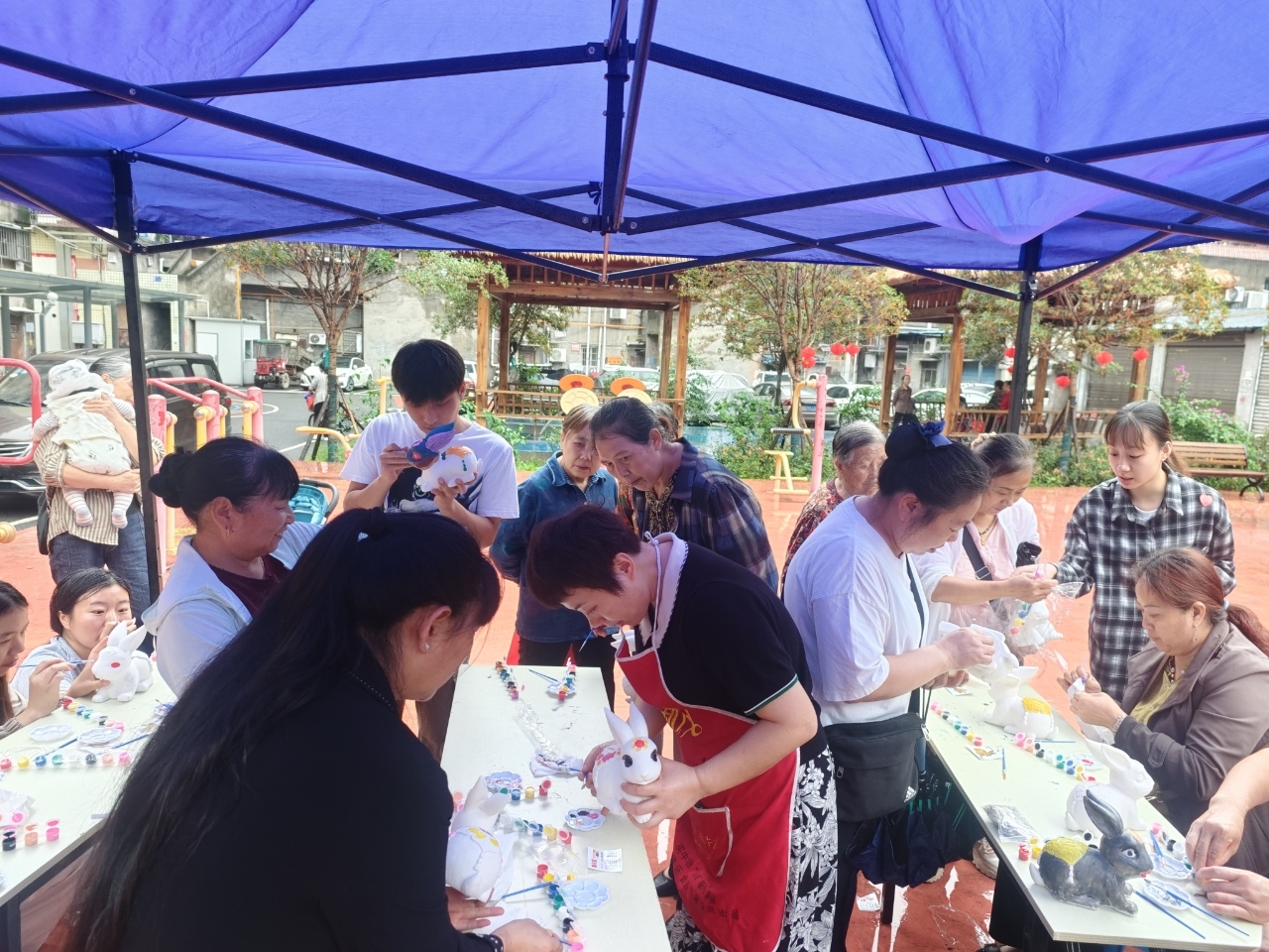 活动现场暖意融融。手工区里,亲子家庭提笔绘 “玉兔”、缝制桂花艾草香囊,指尖流转中秋意;义诊义剪区,医护人员为居民测血压、解健康难题,理发师持工具修剪发型,把社工关怀送进居民心坎;舞台上,舞蹈队裙摆飞扬,戏曲表演唱腔悠扬,台下观众笑意盈盈;两侧红灯笼下,居民猜“中秋习俗”“国庆故事”灯谜,套圈区的欢呼声更是拉近邻里距离。