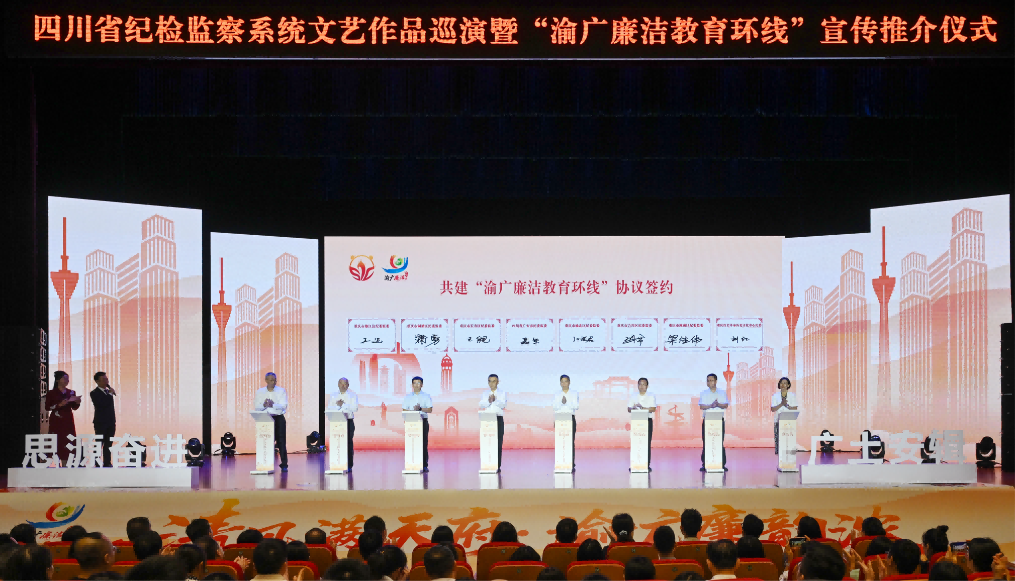 9月29日,四川省纪检监察系统文艺节目巡演暨“渝广廉洁教育环线”宣传推介仪式在广安市举行。活动中,广安市纪委监委与重庆市渝北区、长寿区、合川区、铜梁区、潼南区、垫江县纪委监委以及重庆红岩革命历史文化中心纪委共同签订共建“渝广廉洁教育环线”协议,系统串连渝广两地26个廉洁文化点位,推动形成跨区域、多层次的廉洁教育新课堂。