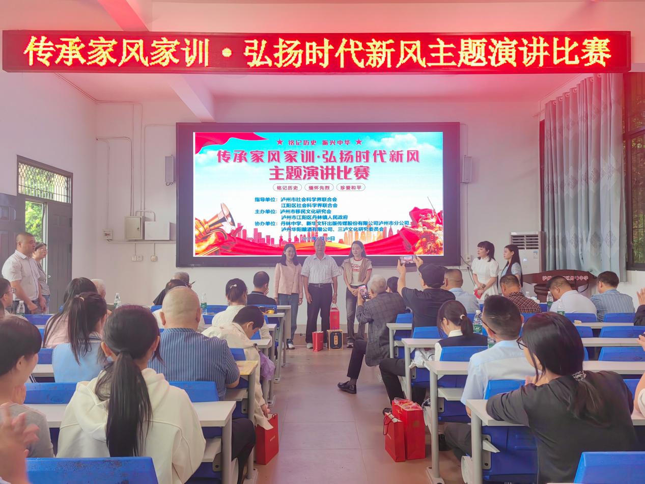 9月30日,由泸州市社会科学界联合会、江阳区社会科学界联合会指导,泸州市移民文化研究会、泸州市江阳区丹林镇人民政府联合主办,丹林中学、新华文轩出版传媒股份有限公司泸州市分公司、泸州华阳酿酒有限公司、四川泸镇老酒有限公司协办的以“传承家风家训·弘扬时代新风”为主题的演讲比赛活动在泸州市江阳区丹林镇中学举行。活动旨在纪念中国人民抗日战争暨世界反法西斯战争胜利80周年,弘扬中华优秀传统文化。