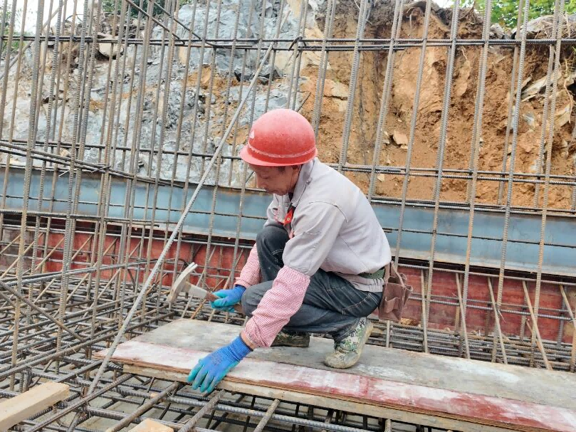 当天,十几名施工人员各司其职,分散在清水池底板钢筋网的各个区域专注开展钢筋绑扎作业:有的蹲在底板上,手指灵活穿梭于钢筋之间,仔细固定每一处节点以确保连接牢固;有的半站在立起的剪力墙钢筋骨架中,一手稳稳扶住钢筋,一手持工具精准加固,每一个动作都透着一丝不苟。钢筋绑扎的细微声响与施工人员的专注神情,共同勾勒出热火朝天的建设图景,为后续混凝土浇筑筑牢坚实根基。