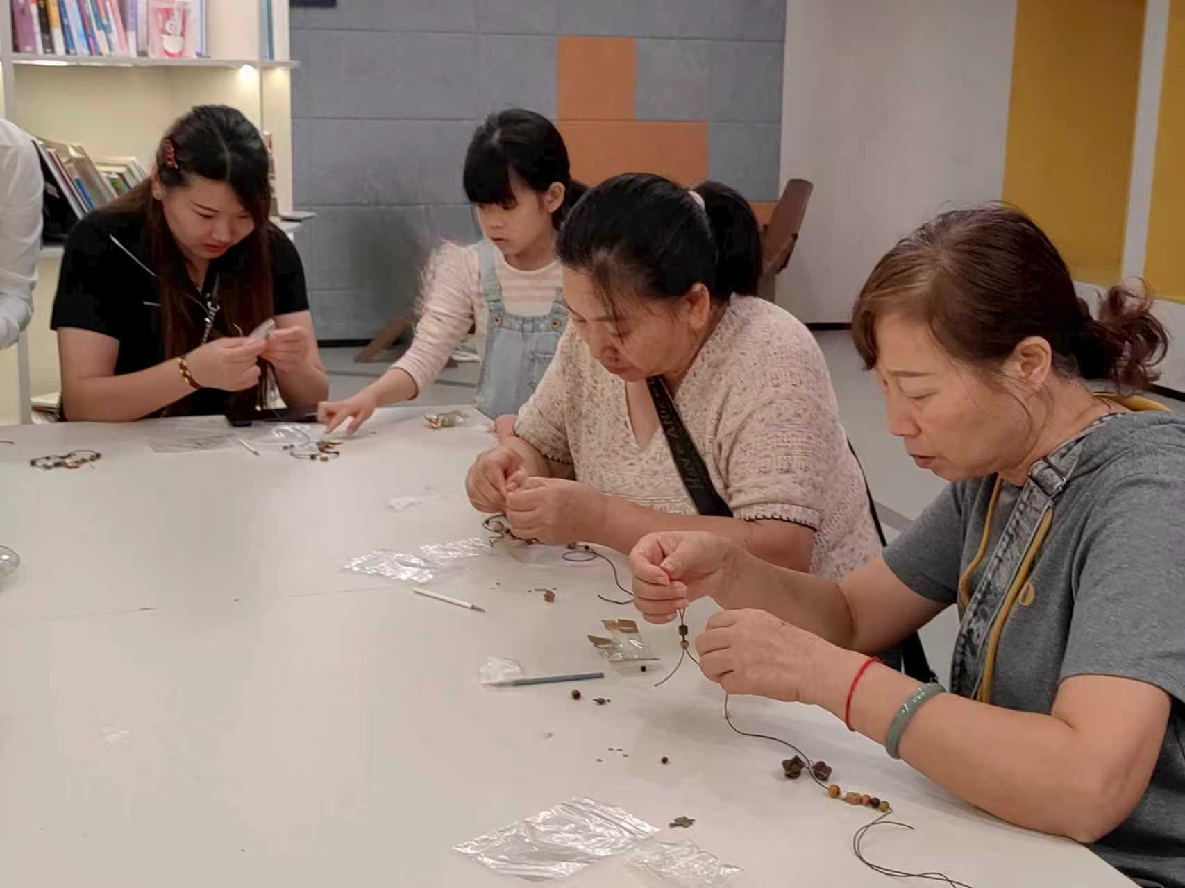 鲁家园社区活动现场设有两大特色体验区,让居民在互动中领略传统文化的魅力。中药材手链DIY区内,老师现场讲解陈皮、艾草、薰衣草等中药材的养生功效,指导居民根据体质挑选药材,搭配玛瑙、菩提等配饰制作专属手链。非遗敦煌飞天拓印画体验区同样备受欢迎。文化企业的非遗传承人通过图文展示和步骤演示,向居民介绍敦煌飞天文化背景与拓印技艺要点。居民们手持拓包,在宣纸与模板间反复按压,原本素净的纸面逐渐浮现出线条优美的飞天图案。不少家长带着孩子共同完成作品,在亲子协作中传承非遗技艺。