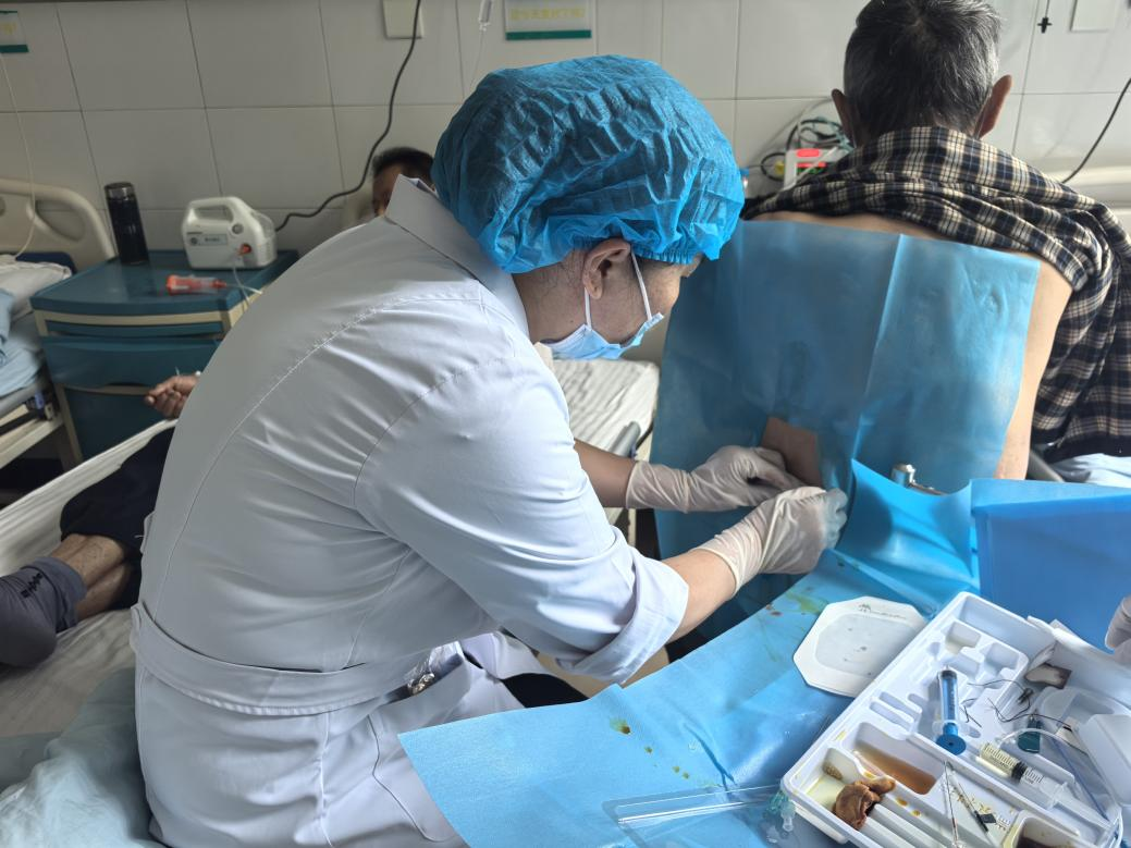 为从根本上解决大量胸腔积液导致的呼吸窘迫,科室团队决定实施胸腔穿刺抽液术。在彩超的精确定位下,医生于局部麻醉后为患者进行了穿刺,整个过程非常顺利,成功抽取了积液。术后,黄先生胸闷、气促等症状明显缓解,生命体征趋于平稳,目前正在逐步康复中。