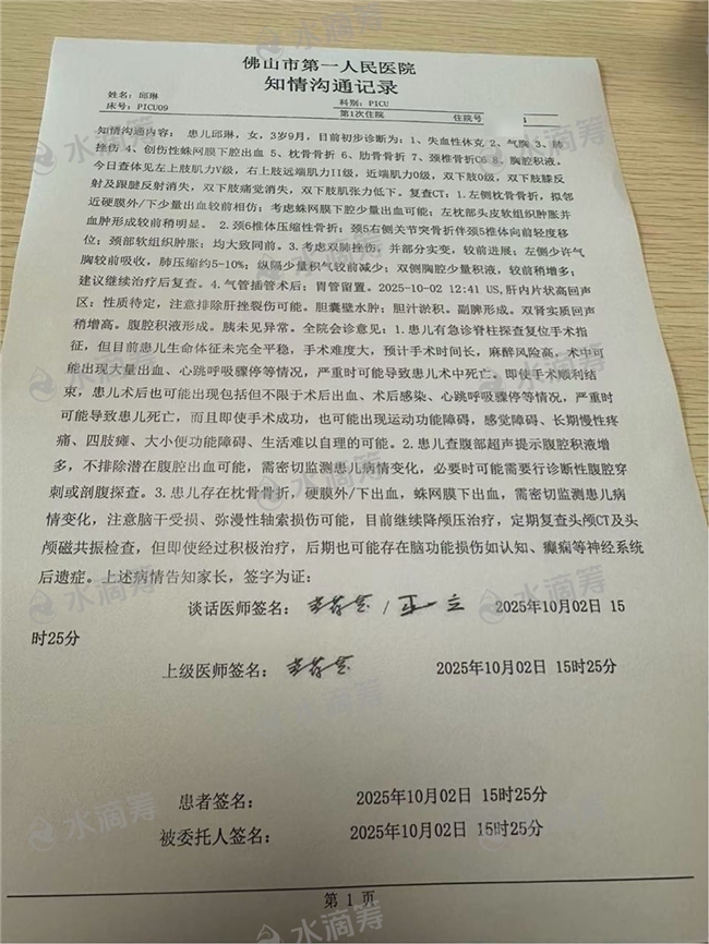 “失血性休克!颈椎骨折!肺挫伤!颅内出血!” 医生的每一句话都像惊雷劈在我们头上。我们连夜从佛山第五人民医院转到市一院ICU,短短16天,已经花光了打工攒下的所有积蓄,还借遍了亲戚朋友。每天上万块的医疗费像无底洞,可孩子还在昏迷,医生说后续还要做多次骨折复位手术、长期康复治疗……至少还需要50万!