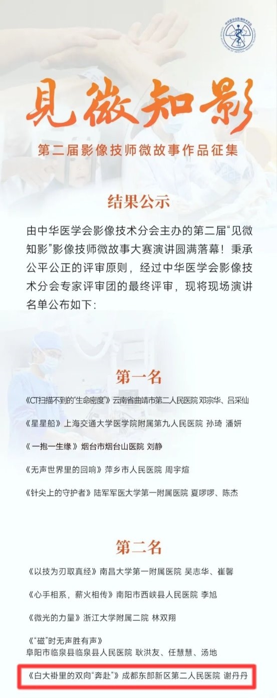 除学术成果外,在中华医学影像技术分会主办的第二届“见微知影”影像技师微故事大赛中,谢丹丹技师长的作品《白大褂里的双向奔赴》荣获二等奖。该赛事旨在挖掘影像技师群体的暖心故事,彰显医务工作者的责任与担当。谢丹丹技师长以细腻笔触记录了日常工作中与患者的温情互动,生动展现了成都东部新区第二人民医院影像技师在精准操作之外的人文关怀,让社会大众看到了“隐形天使”们的专业与温度。