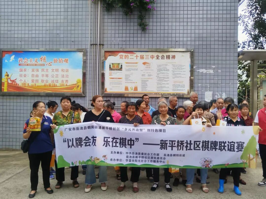 昨日岳池县朝阳街道新平桥社区外场坝暖意融融,老年棋牌联谊赛圆满举办。作为社区 2024 年城乡治理 “多元共治” 特色创建项目的重要实践活动,本次赛事由中共岳池县委社会工作部、岳池县朝阳街道办事处、新平桥社区居民委员会联合主办,华蓥市阳光社会工作服务中心承办,以老年人喜闻乐见的棋牌竞技为纽带,让 “多元共治” 理念在温情互动中扎根老年群体。