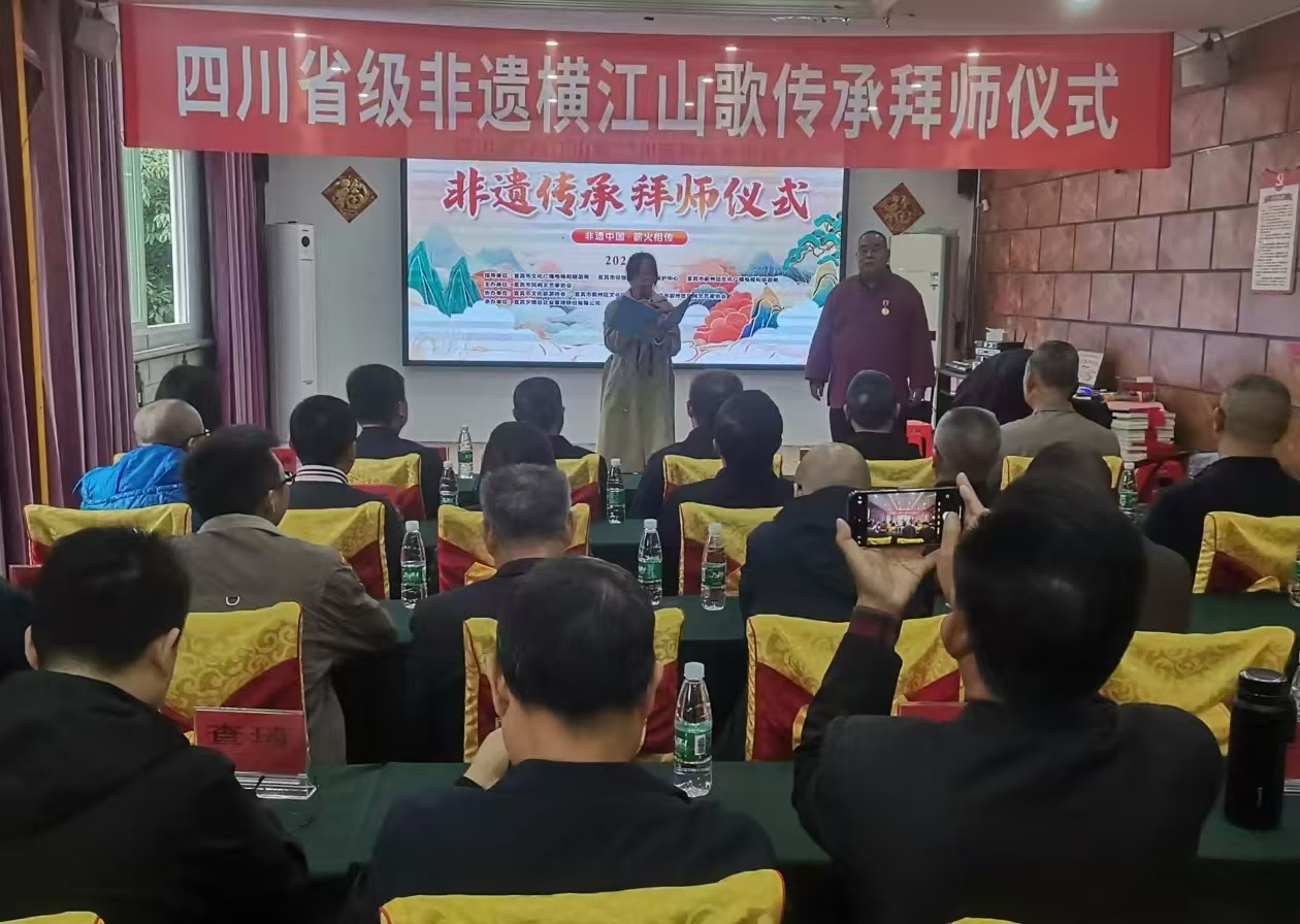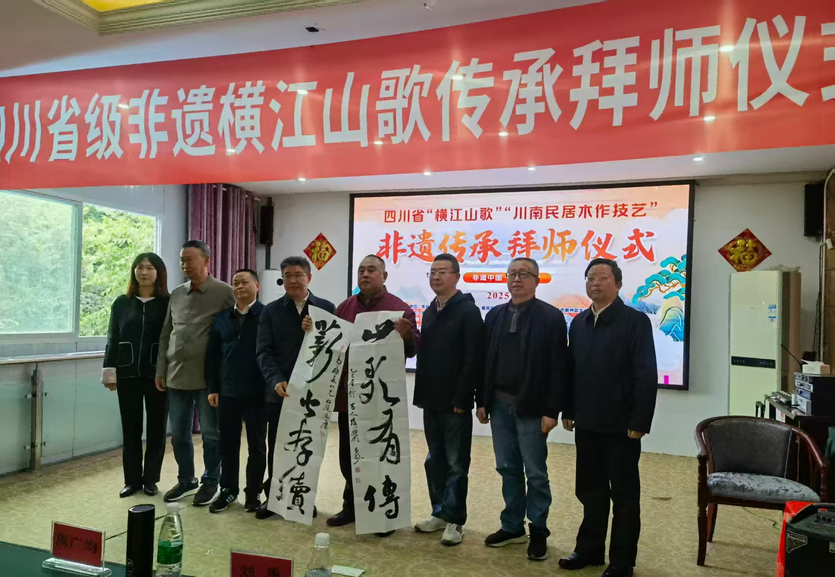 横江山歌传承人郑启友,他出生在横江农村,从小在他奶奶及父母嘹亮动听的山歌声中成长。郑启友从小耳濡目染横江山歌,对横江山歌情有独钟,他工作后拜访了许多当地会唱山歌的中老年人,收集了大量第一手素材,系统学习整理研究横江山歌,传承其动人的核心精神。横江山歌在川南叙州区等地广为流传,是劳动人民的智慧之歌, 凝聚着巴蜀人民的艺术智慧。郑启友既是横江山歌的传承人,又是传播者,在仪式上,他正式收了刘美等5位热爱山歌,有志于传承横江山歌的爱好者为徒,共同学习研究传承传播横江山歌,让非物质文化遗产项目代代相传,生生不息。(严为远)