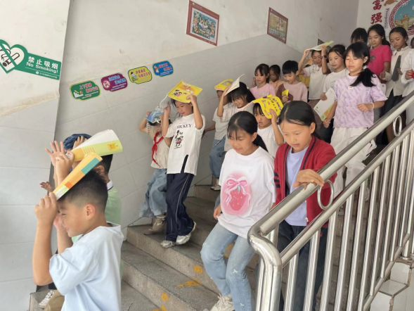 第一声警报铃声响起,全体教师迅速到岗,班主任引导学生在教室内就地隐藏避险,双手护头、屈膝弯腰躲在课桌下方。随后,现场指挥邹序通过广播发出疏散指令:“请各班立即按照预定路线有序撤离!”全校师生立即启动应急响应,班主任按照预先编排的队形,带领学生沿指定路线快速撤离,过程中师生保持安静、动作规范,无推拉、拥挤现象。楼道护导教师在各楼层、楼梯口全程值守,维护秩序,严防踩踏风险。
