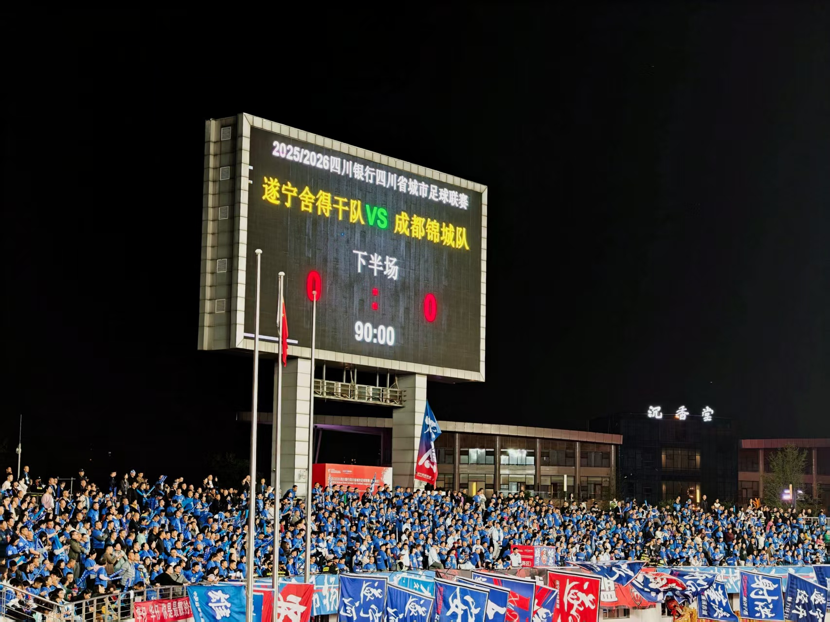 10月26日晚,遂宁河东体育中心主场的灯光将绿茵场照得亮如白昼,当裁判终场哨音划破夜空,比分牌上0:0的数字定格瞬间,全场球迷的欢呼如浪潮般席卷赛场!108分钟的胶着鏖战,主力门将早早染红离场,遂宁舍得干队以十人作战的钢铁意志,硬生生顶住了成都队的狂攻,不仅终结了对手的五连胜,更成为川东赛区首个从这支强队手中夺分的队伍!这份在逆境中拼出的平局,没有进球的狂欢,却满是热血的逆袭,是刻在遂宁人骨子里的“舍得干”精神,在绿茵场上最动人的绽放。