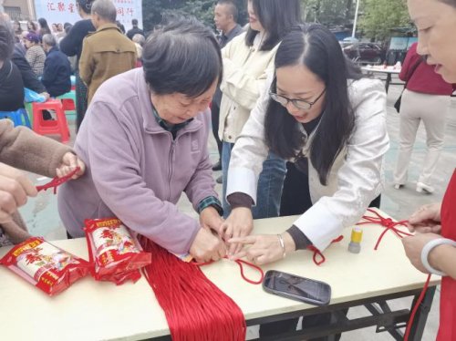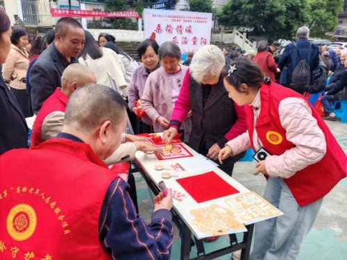 “编织时光”区域内,红绳在长者们的指尖灵活翻飞,在专业老师的悉心指导下,一个个寓意吉祥的中国结渐渐成型。大家拿着自己的作品相互展示、交流技巧,成就感十足。“金石为开” 福字拓印区更是人气高涨,长者们亲手蘸取印泥、细心拓印,当 “福”“寿” 二字清晰跃然纸上时,现场响起阵阵欢呼,传统技艺的独特魅力让每个人都乐在其中。