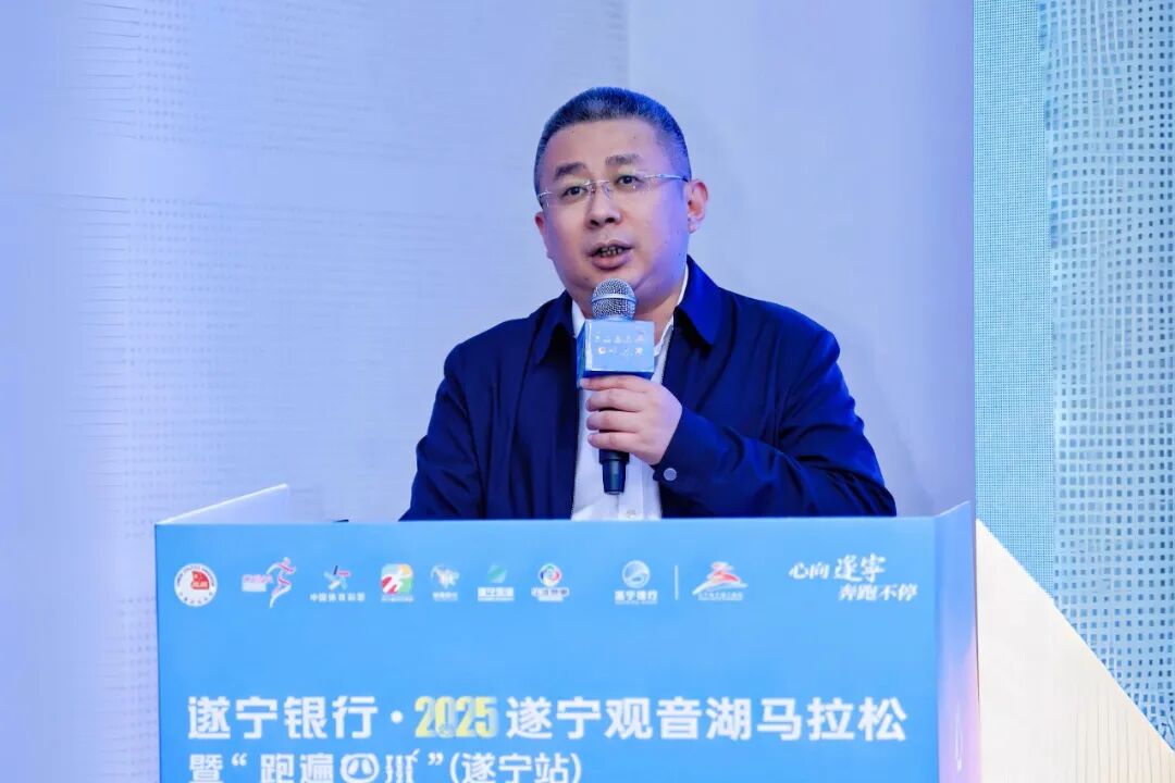 刘红军在致辞中表示,马拉松“挑战自我、永不言弃”的精神,与遂宁银行扎根本土、服务民生的初心同频共振。遂宁银行愿以金融活水为笔,描绘文体旅融合发展的美好图景,让遂宁的山水灵韵与人文风情,随跑者的足迹走向更广阔的天地。