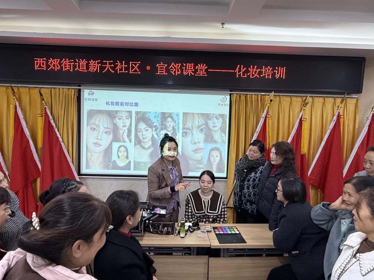 为帮助社区居民掌握实用化妆技能,提升职场竞争力与日常审美自信,让大家在生活中更好地展现自身风采,近日,宜宾翠屏西郊街道新天社区“宜邻课堂”精准对接居民需求,精心策划的化妆培训公益课在社区多功能活动室温馨开课,20余名居民怀揣对美好生活的向往踊跃参与,现场交流热烈、学习氛围十分浓厚。