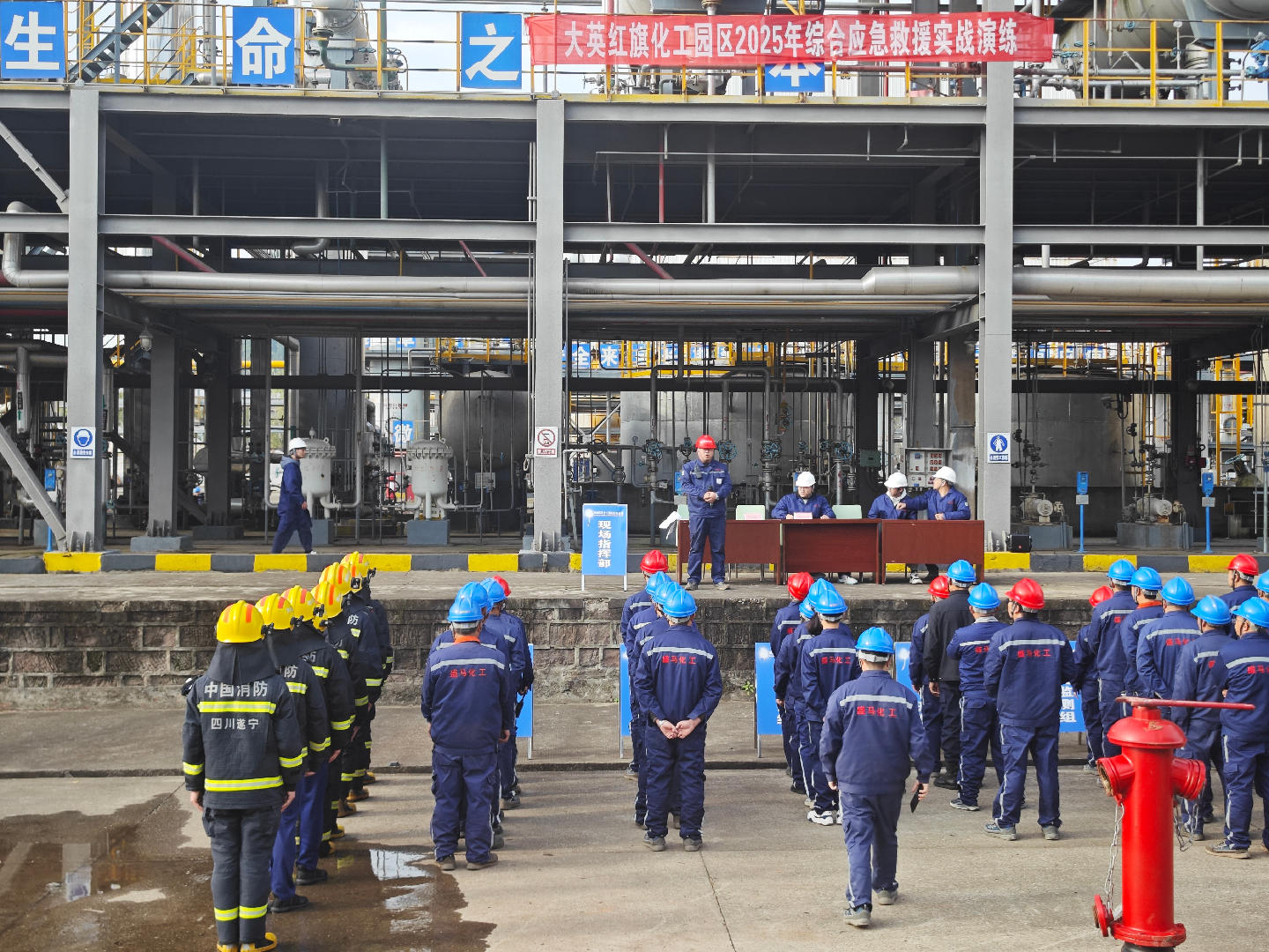 为进一步提升应对危化品泄漏着火、中毒事故、突发环境事故处置的能力和水平,11月20日,大英消防联合四川盛马化工股份有限公司开展2025年下半年综合应急预案演练,大英消防等多方力量参与,旨在全面提升园区应对危化品突发事件的应急响应与协同处置能力。