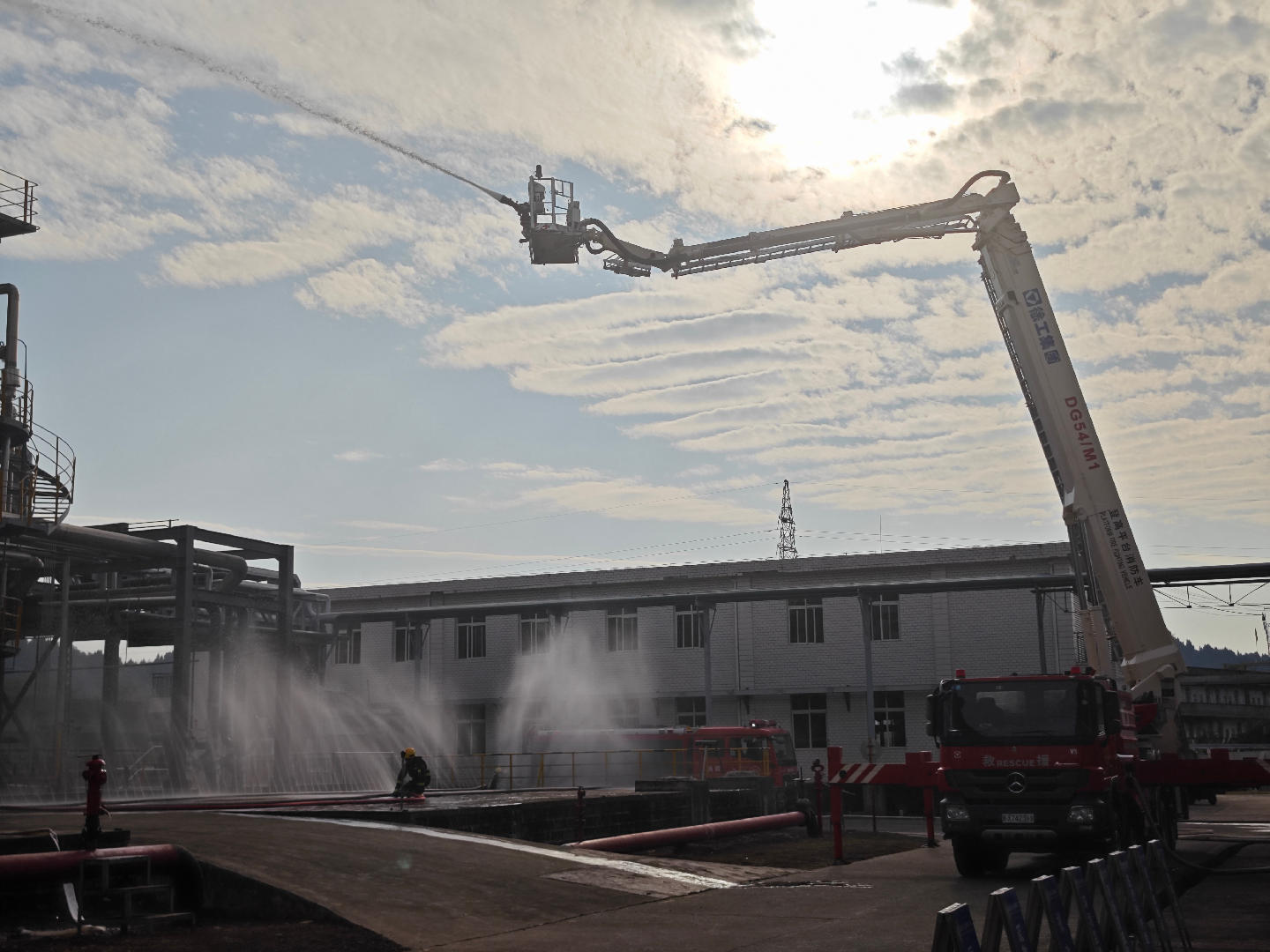 演练模拟盛马化工催化汽油加氢装置区发生油气泄漏着火,现场产生大量浓烟并伴有明火,情况万分危急。盛马化工对突发事件应急响应,公司各级人员层层递报事故信息。大英大队接到报警后,迅速启动应急响应机制,第一时间赶赴事故现场。现场指挥员临危不乱,科学决策,果断下令出动登高平台消防车占据有利位置,对高处着火点及受威胁设备进行精准冷却和灭火作业;同时,消防指战员迅速铺设水幕水带,在火场周围成功构建起一道隔离稀释屏障,有效阻止了火势蔓延与灾害扩大。整个处置过程衔接紧密、战术运用得当,充分彰显了消防救援队伍“拉得出、冲得上、打得赢”的过硬作风。