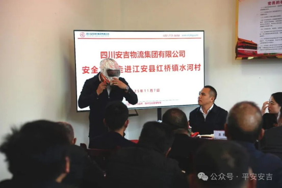 “乡亲们,冬天烤火取暖、熏制腊肉要注意通风,电线老化了可得及时换,另外我再给大家复训下消防面具的正确佩戴方式,大家仔细看看!”在江安县红桥镇水河村的院坝里,安吉集团工作人员结合农村居住分散、用火用电习惯特殊、冬季火灾风险高等特点,用“方言+案例”的方式向村民讲解安全知识。活动现场播放了农村典型火灾警示教育片,演示了灭火器、防毒面具等应急物资使用方法,还为大家发放了安全知识手册和应急救援包。