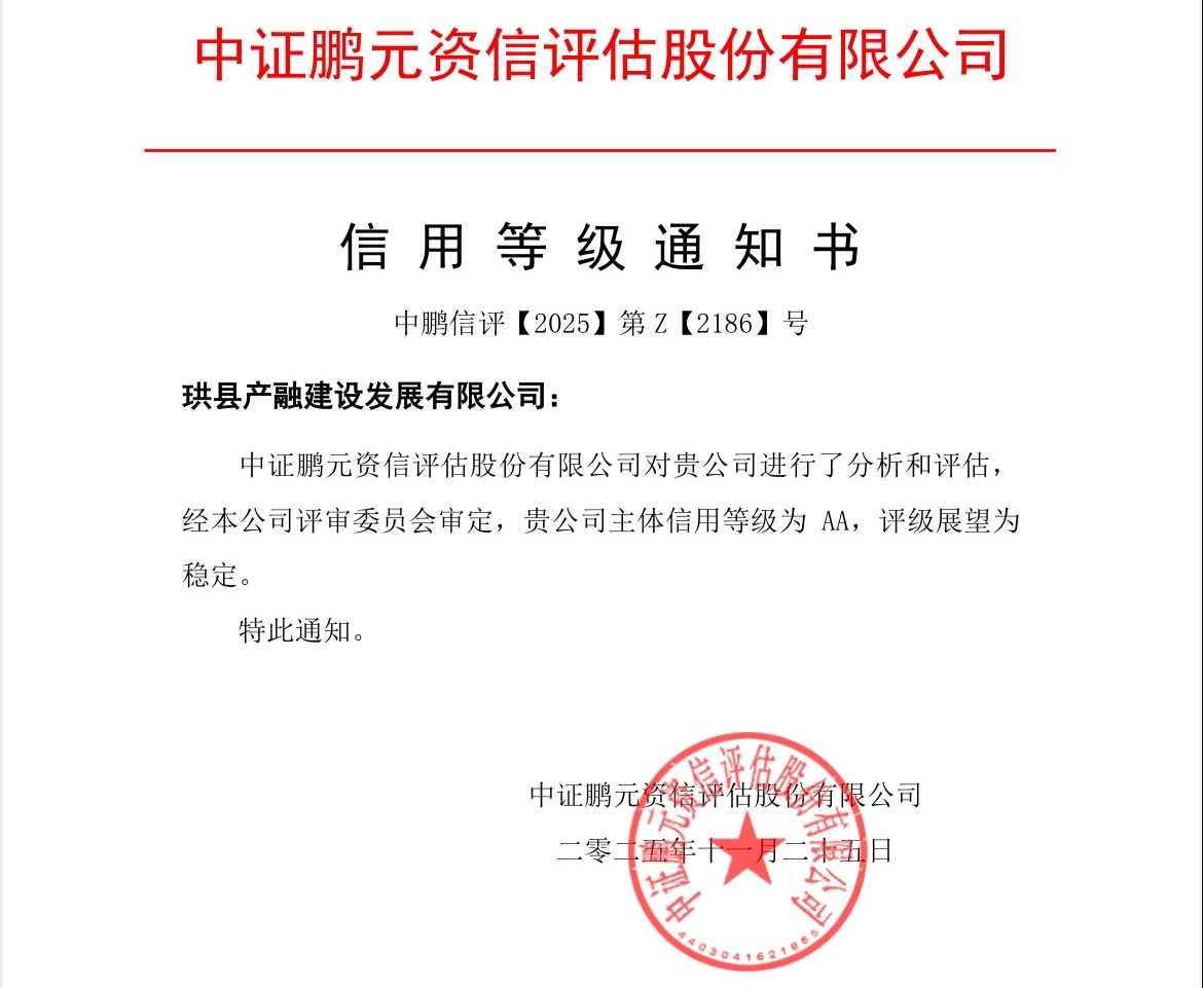 近日,珙县产融建设发展有限公司(以下简称“县建发公司”)获国内权威信用评级机构中证鹏元资信评估股份有限公司综合评定,成功斩获主体信用AA级评级,评级展望为稳定,标志着该企业综合实力与发展潜力获资本市场高度认可。
