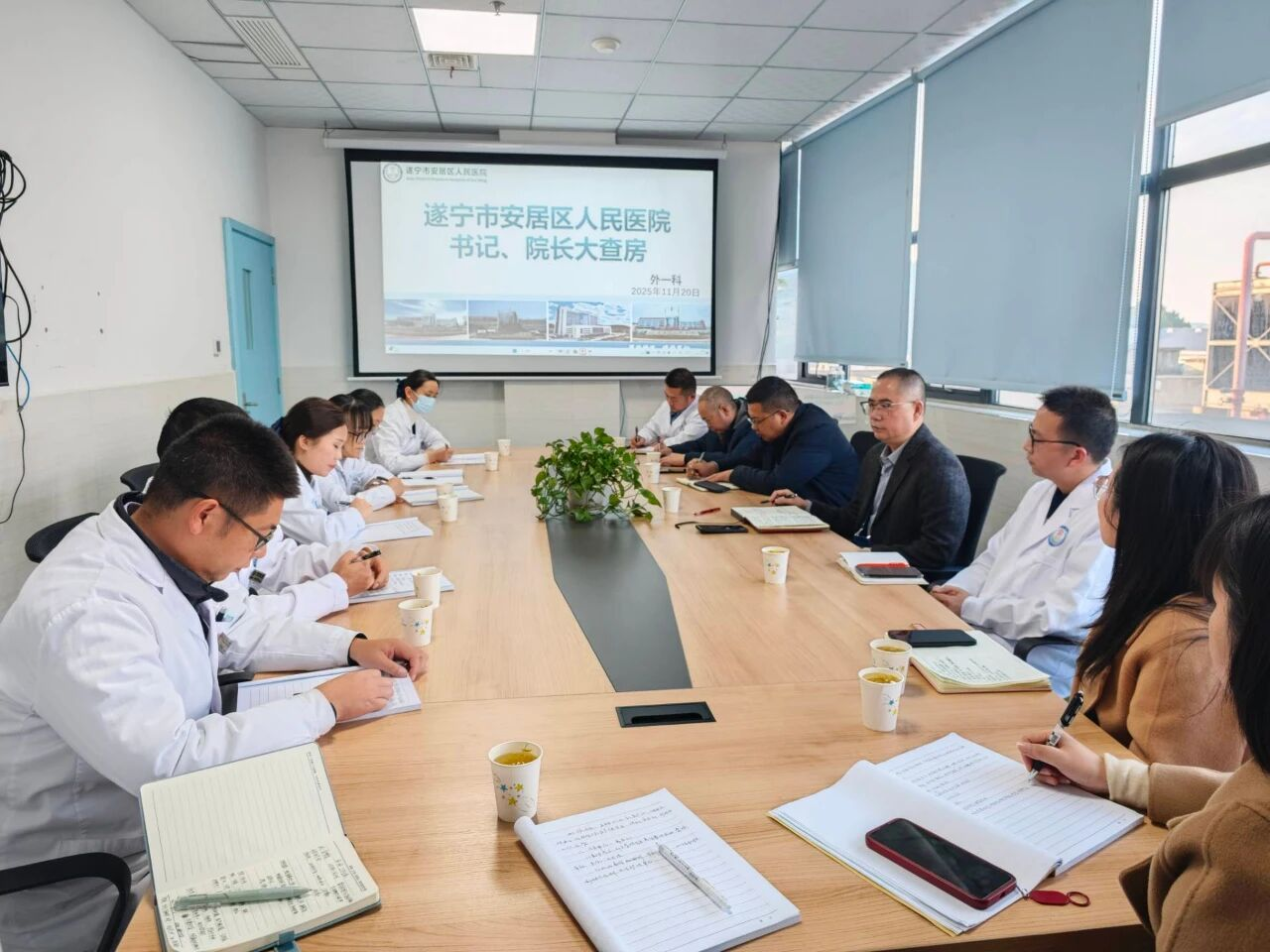 为进一步夯实科室管理根基,破解发展瓶颈难题,全面提升医疗服务质量与内涵,11月20日,安居区人民医院党委书记蒋礼、院长王超平带队,会同党委委员及党委办、医务科、护理部等职能部门主要负责人,赴外一科开展11月党委书记、院长大查房。此次查房以“听取汇报—现场研讨—部署任务”的流程,精准聚焦外一科发展痛点、难点,为科室高质量发展定向领航、赋能增效。