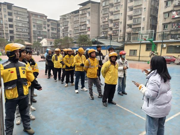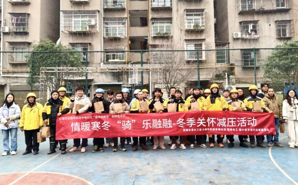 2025年12月9日,在前锋区委社工部、大佛寺街道的有力指导下,为提升社区社会组织服务能力,切实关爱新就业群体身心健康,纾解外卖、快递小哥等骑手冬季配送工作身心压力,前锋区稻草社工服务中心联合幸福社区福小安平安行志愿服务队,在阳光雅居小区开展“情暖寒冬·‘骑’乐融融”冬日关怀减压趣味活动。30名骑手齐聚一堂,在趣味运动中卸下疲惫、感受温暖、收获开心。